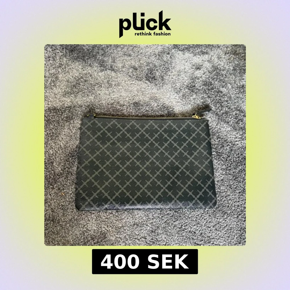 Stilren svart kuvertväska från By Malene Birger med grått rutmönster och guldfärgad dragkedja. Går att använde som clutch men även som vanlig väska då väskhandtaget är avtagbart. Finns några enstaka repor på väskan som ni ser på bilderna