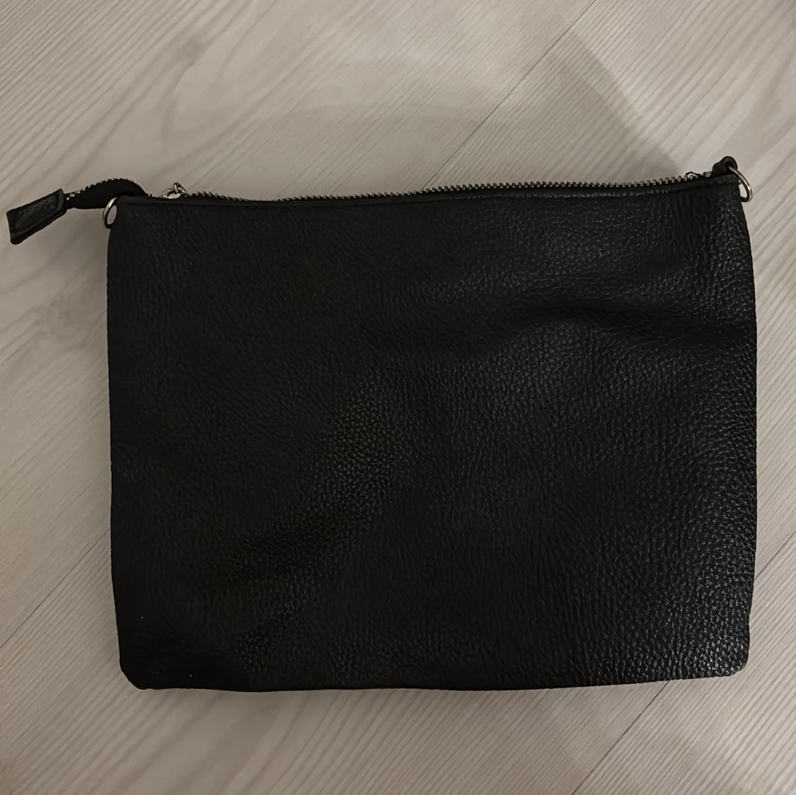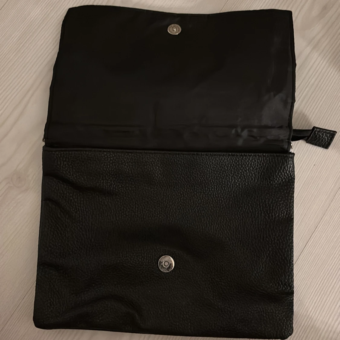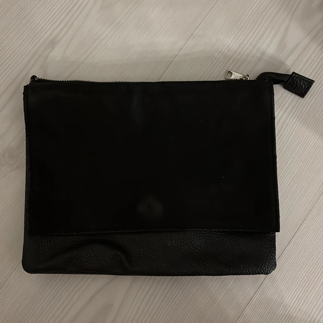 Stilren svart kuvertväska som kan bli en axelrem väska. det är både ett skinnande material och mocka material. Har en stor huvudficka som går att dra igen med dragkedja och sedan en annan ficka som har en magnet som fäste. Den är från H&M och är i bra skick, men dock har Moca materialet slitit lite då magnetkhnappen är under, se sista bild.