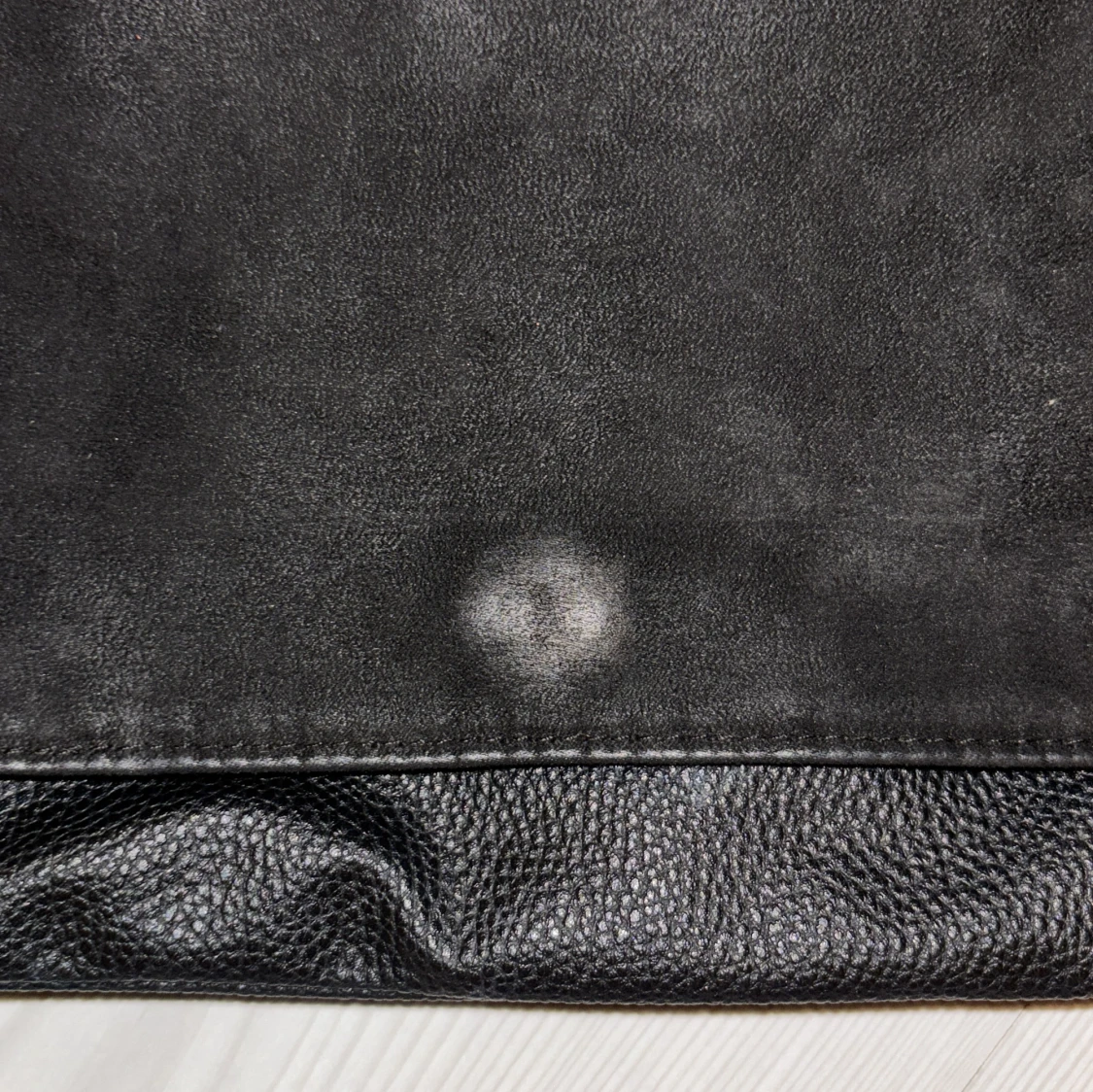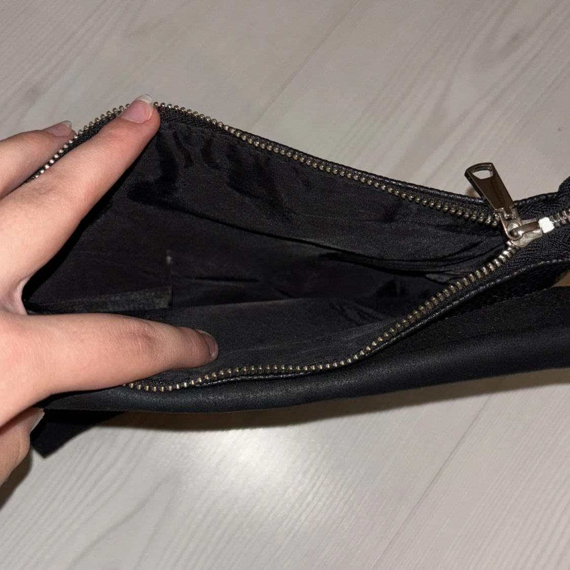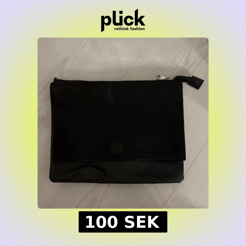 Stilren svart kuvertväska som kan bli en axelrem väska. det är både ett skinnande material och mocka material. Har en stor huvudficka som går att dra igen med dragkedja och sedan en annan ficka som har en magnet som fäste. Den är från H&M och är i bra skick, men dock har Moca materialet slitit lite då magnetkhnappen är under, se sista bild.