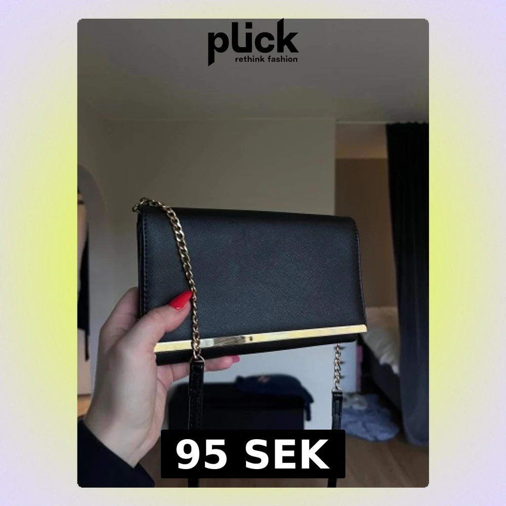 Stilren svart kuvertväska med guldfärgad kedja och spegel inuti. Praktiska innerfack med dragkedjor, stilren och fin. Några små skavanker på insidan och några få repor på guldkanten utanpå. Annars väldigt fin 🤍 12x20cm stor, bandet är ca 130cm långt! - Köper du innan kl 16:00 kan jag posta samma dag!