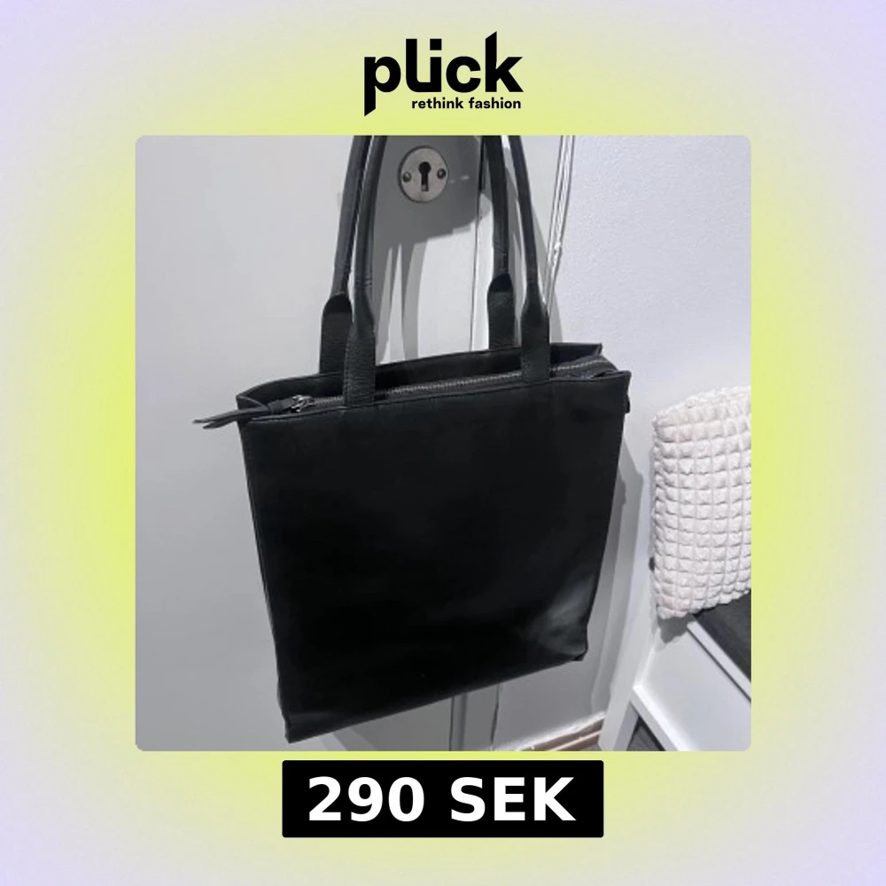 Snygg och stilren svart axelväska i skinn med praktisk dragkedja upptill. Väskan har två handtag och en rymlig insida med fack för dator och två andra lite mindre fack.