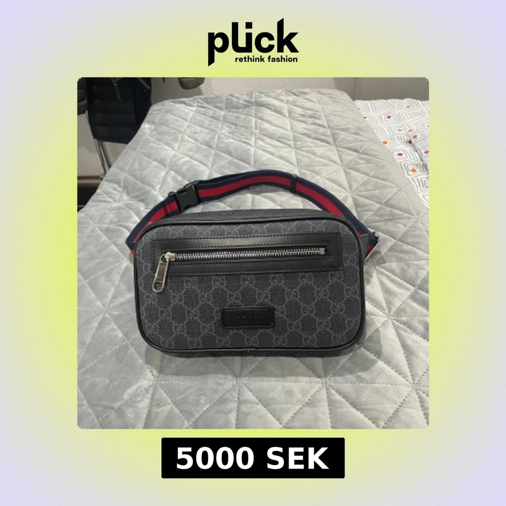 Snygg svart midjeväska från gucci med diskret mönster och justerbart band i rött och blått. Väskan har en praktisk dragkedja framtill och är perfekt för att hålla dina saker säkra och nära till hands.