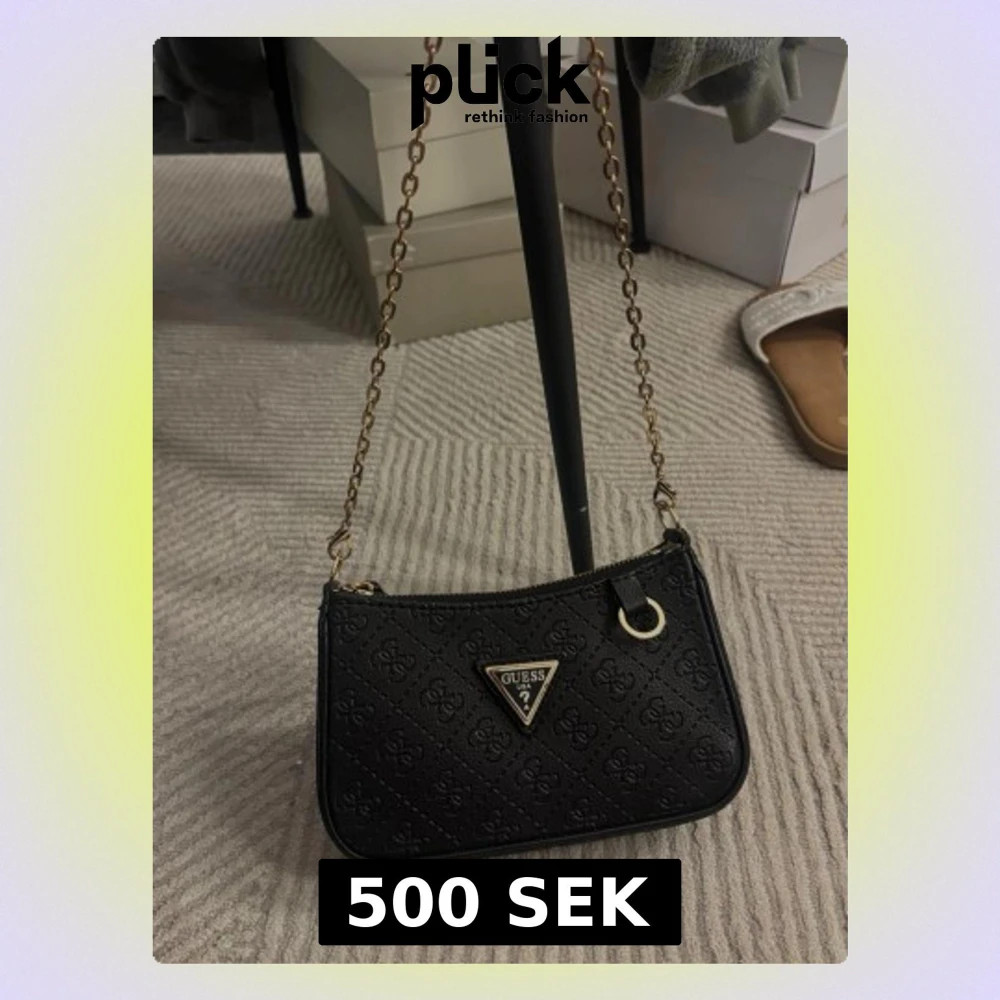 Svart mini-axelväska i strukturerat material med präglat mönster. Guldfärgade detaljer och tunn kedjerem ger en nätt men markerad look. Dragkedjestängning upptill och kompakt storlek – perfekt för mobil, kort och nycklar.❤️