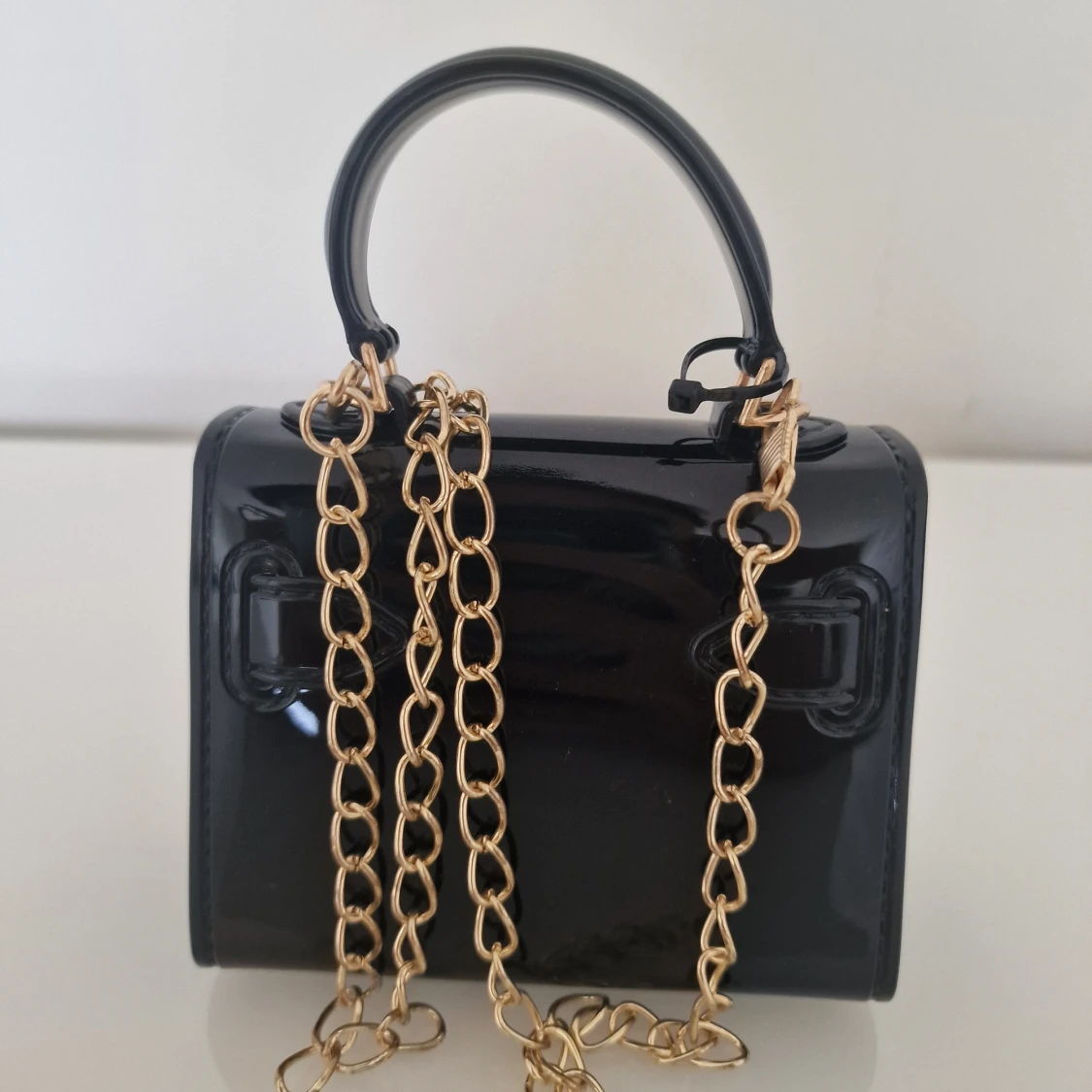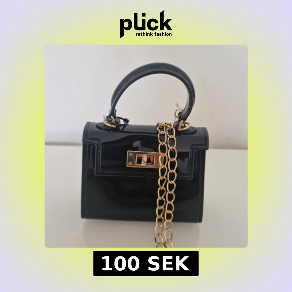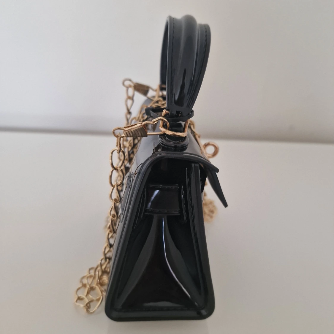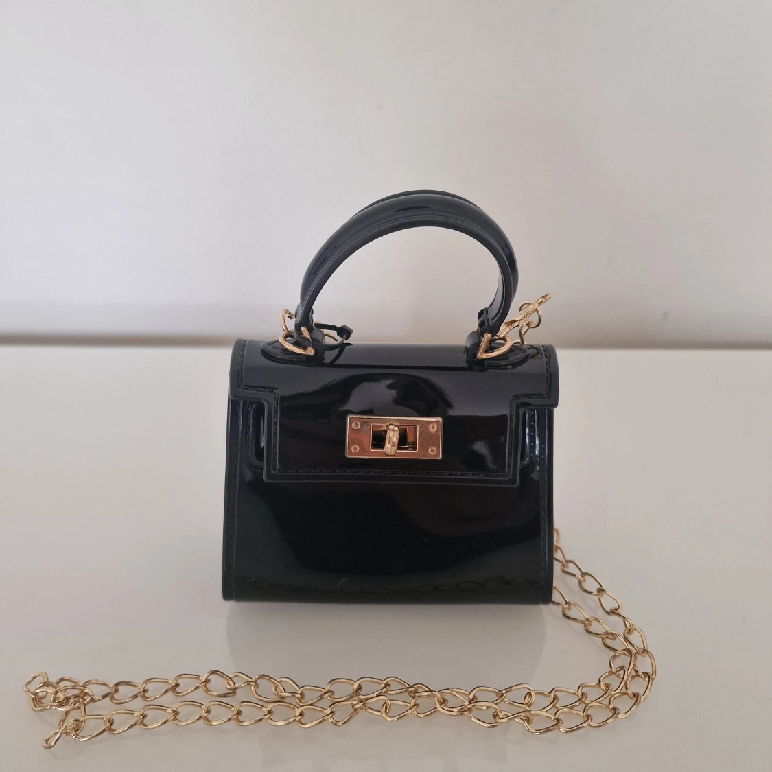 Snygg svart minihandväska i glansigt material med guldfärgad kedja och vridlås framtill. Väskan har ett stilrent och modernt uttryck med ett stadigt handtag och detaljer i guld. Perfekt accessoar för att lyfta din outfit.