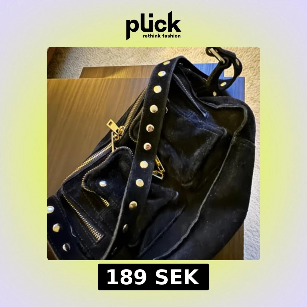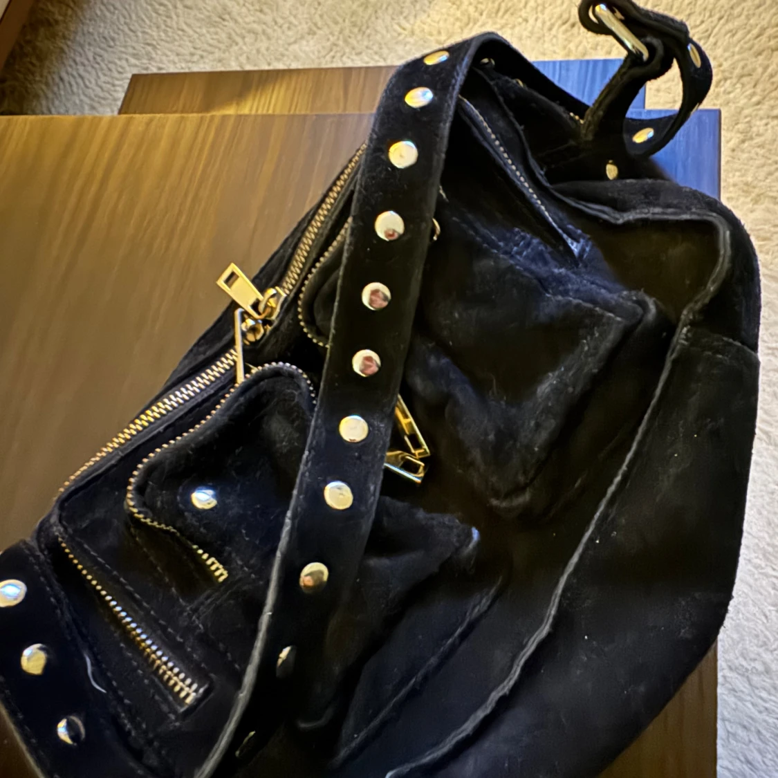 svart axelväska i mocka med silvtiga dragkedjor och stora silverfärgade nitar på axelremmen. Från märket NUNOO.