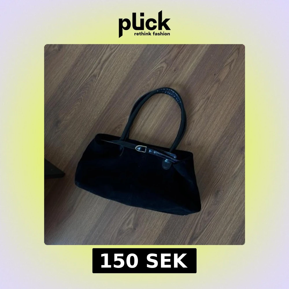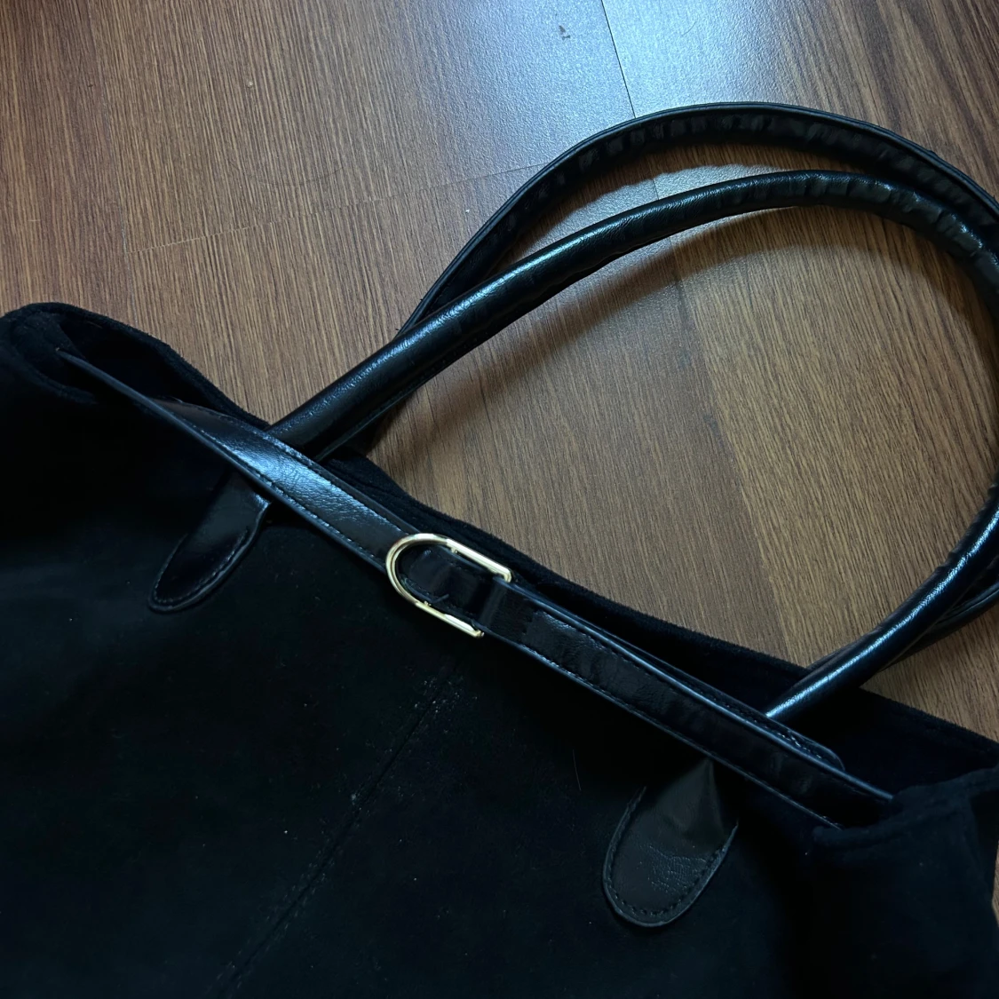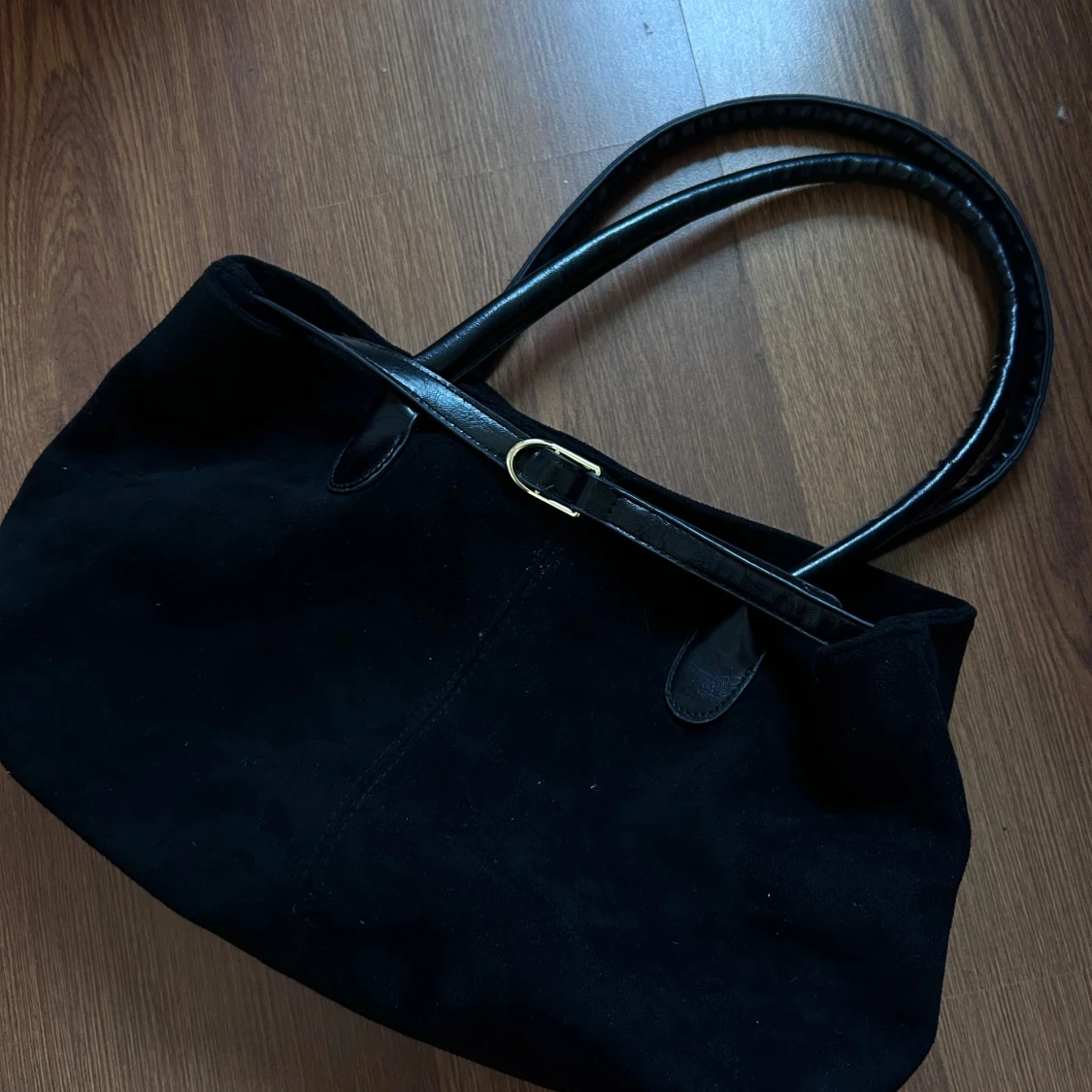 Svart handväska i mocka med stilrena handtag i skinn och snyggt bältedetalj med guldfärgat spänne. Väskan har ett rymligt brunt innerfoder och en praktisk innerficka med dragkedja. Perfekt storlek för att få med allt du behöver. Väldigt fint skick