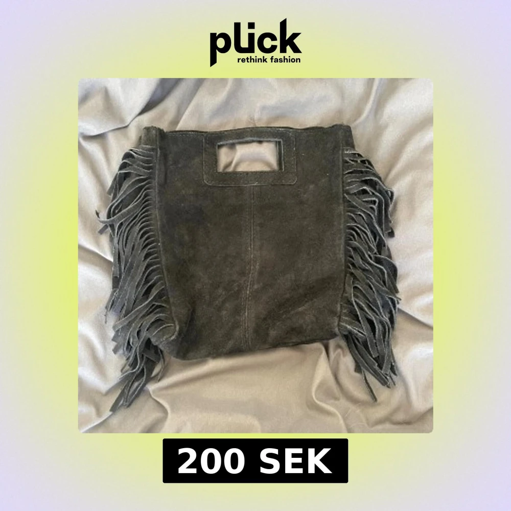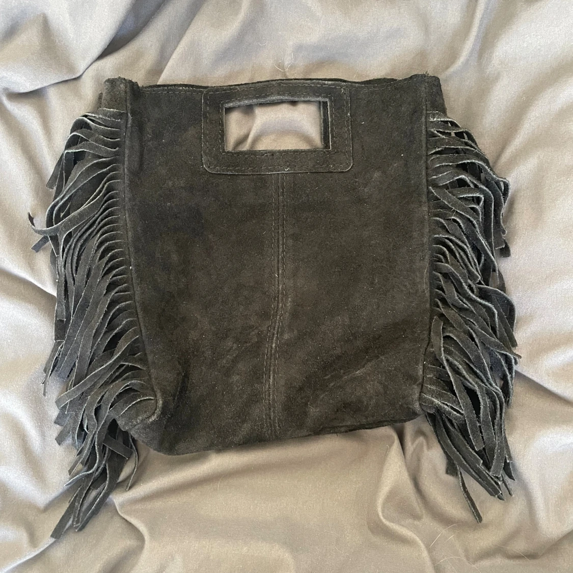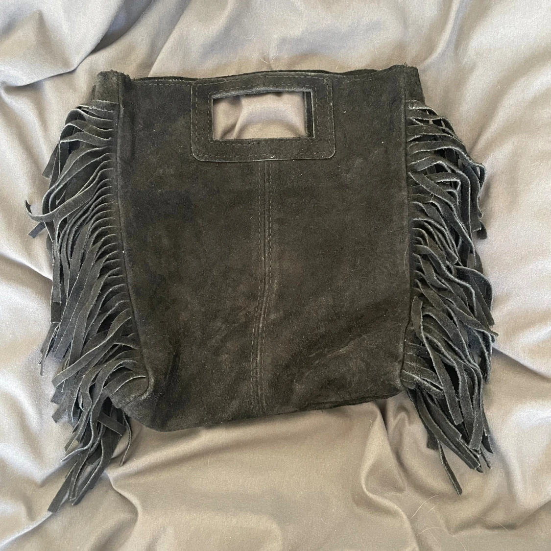 Cool svart handväska i mocka med fyrkantigt handtag och långa fransar längs sidorna. Väskan har en stilren och lite bohemisk vibe, perfekt för dig som vill sticka ut. Rymmer det viktigaste och är lätt att bära i handen.