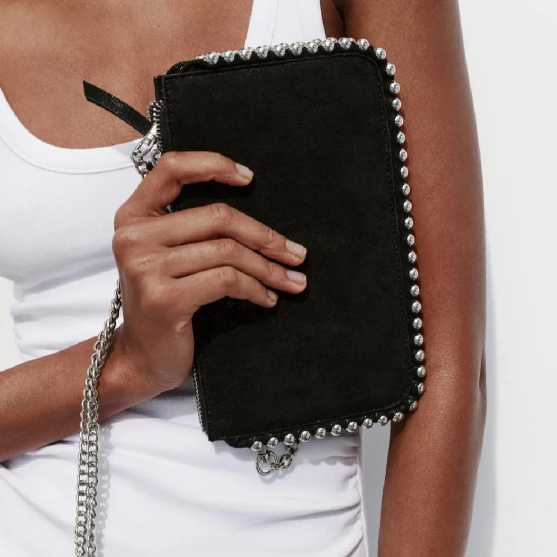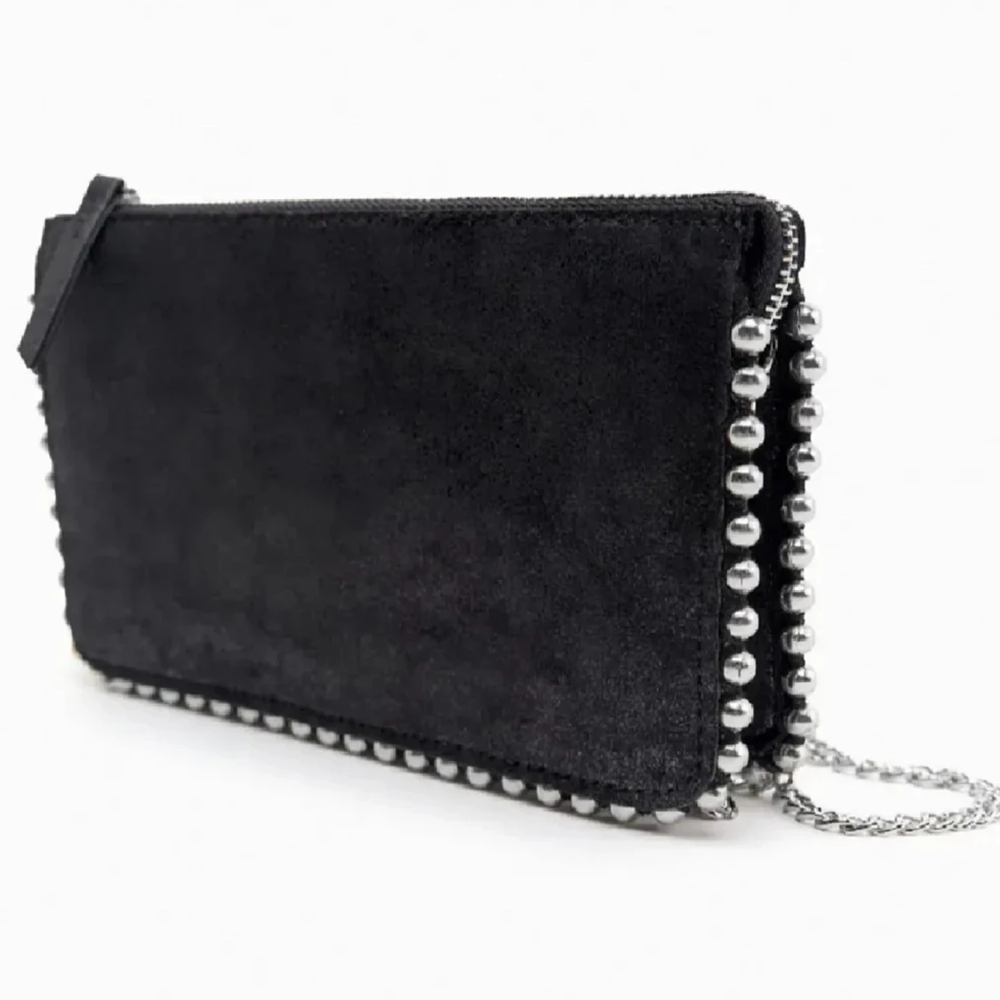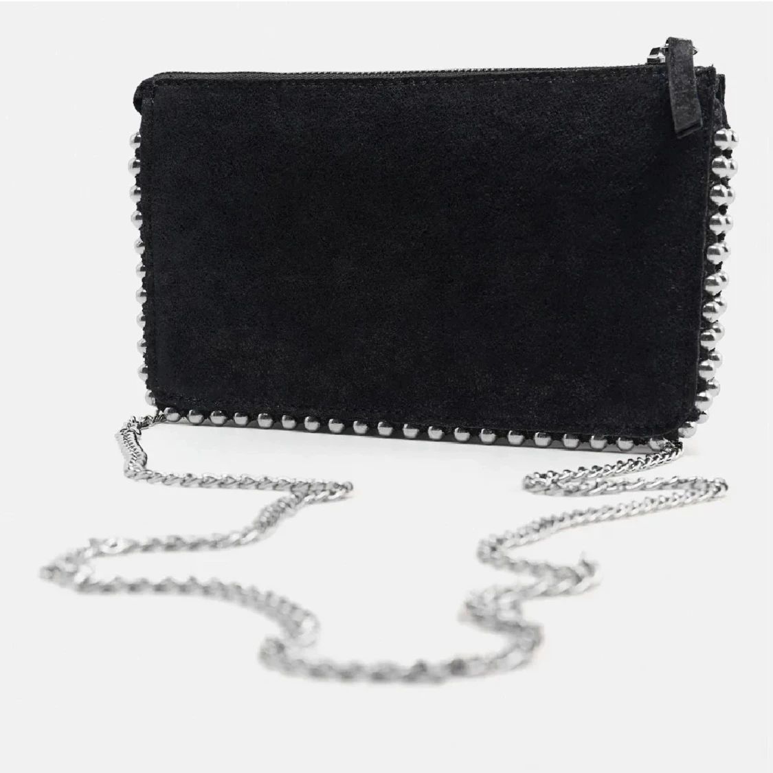 Snygg svart kuvertväska i mocka med silverfärgade nitar längs kanterna och en lång kedjerem. Väskan har dragkedja upptill och en stilren, rektangulär form som ger en edgy vibe. Perfekt för att lyfta din outfit med lite extra attityd.