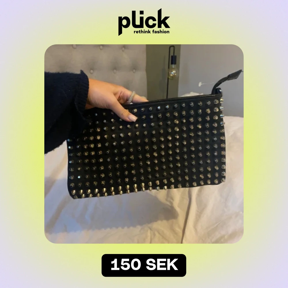 En svart kuvertväska med nitar på, stor och rymlig ( större än vanliga kuvertväskor, se på sista bild ) . Okänt märke , inga defekter och i oanvänt skick .