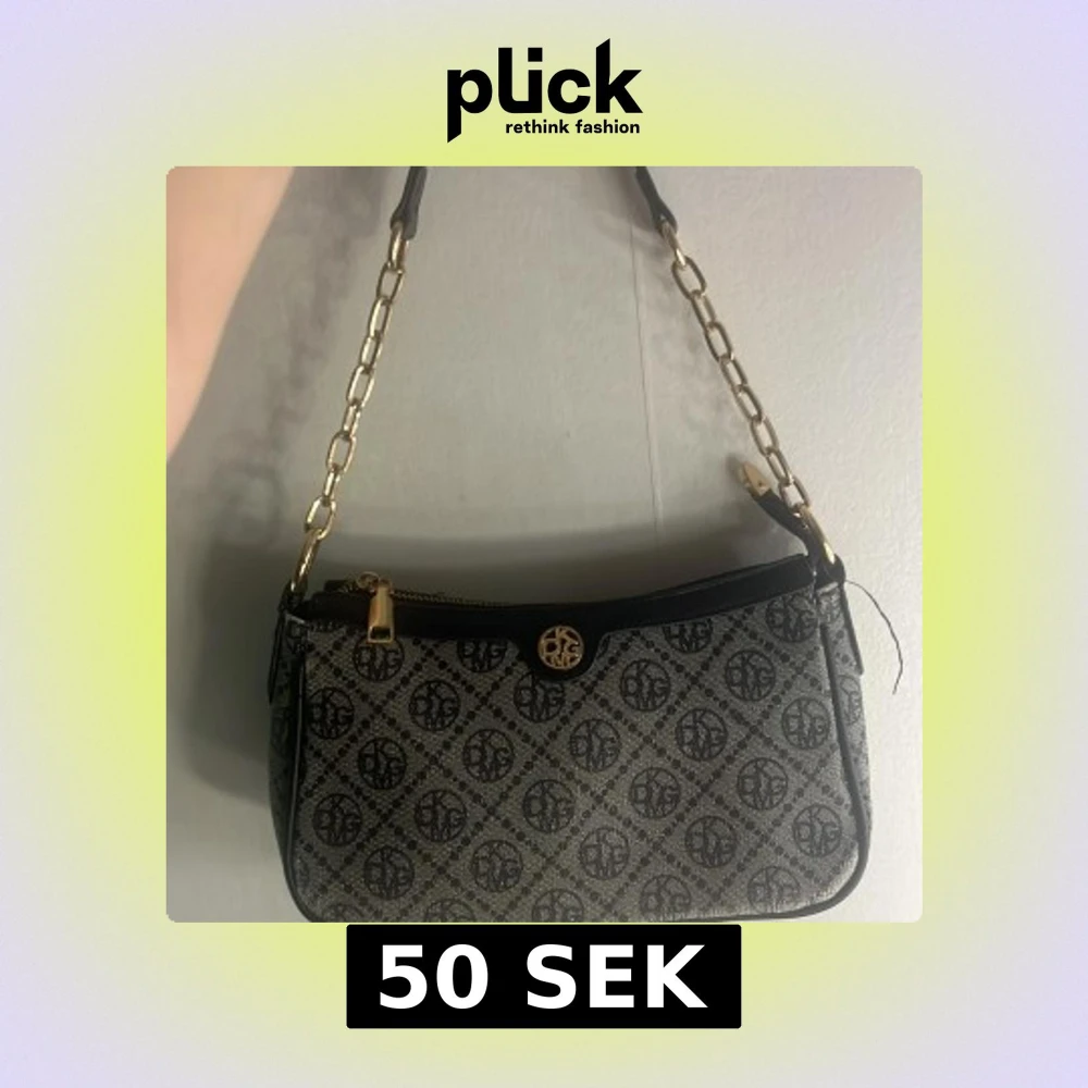 Snygg axelväska från River Island i svart och grått med monogrammönster. Väskan har guldfärgade kedjedetaljer på axelremmen och dragkedja upptill. Perfekt storlek för det viktigaste och en stilren accessoar till din outfit.