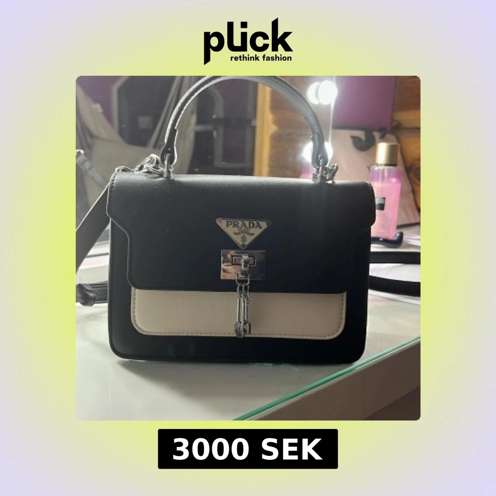 Snygg svart och vit handväska från Prada med klassisk triangel-logga framtill. Väskan har både handtag och axelrem, samt ett elegant lås med kedjedetalj. Tillverkad i skinn och perfekt för digsom vill ha en stilren accessoar med lyxig känsla.