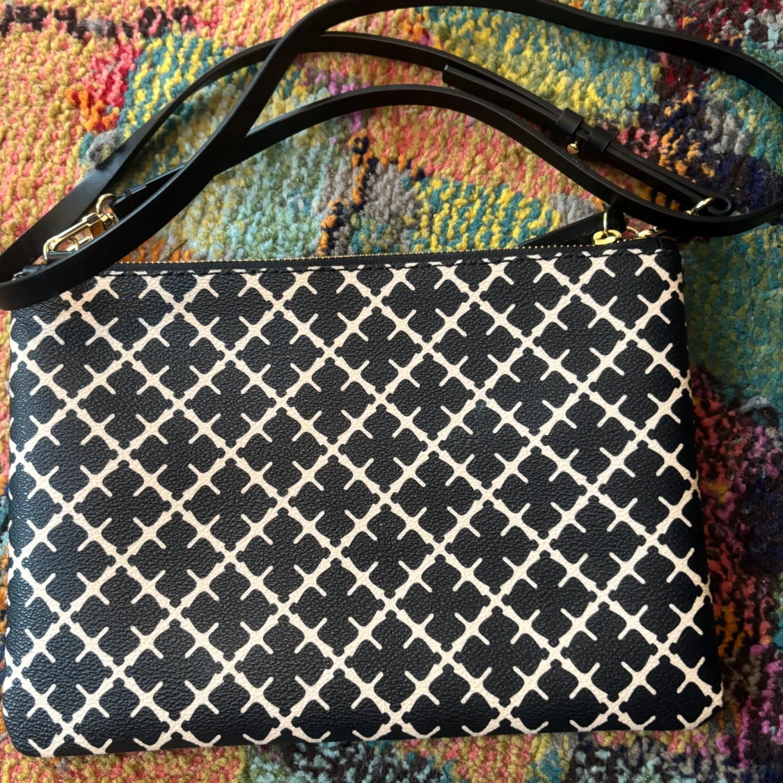 Snygg axelväska från Marlene Birger med ett stilrent svart och vitt mönster. Väskan har en praktisk dragkedja och är perfekt för att bära dina nödvändigheter. Den är helt oanvänd och i mycket bra skick. Ordinarie pris på väskan är 900kr. Köparen står själv för frakten.