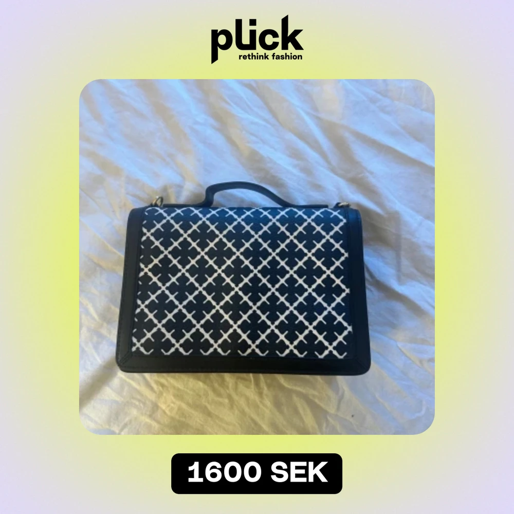 Säljer en superfin svart och vit mönstrad väska med ett coolt geometriskt mönster. Väskan har en praktisk dragkedja och en smidig handrem. Perfekt för att ge din outfit en stilren touch! Väskan är ifårn märker bymalene birger jätte fin