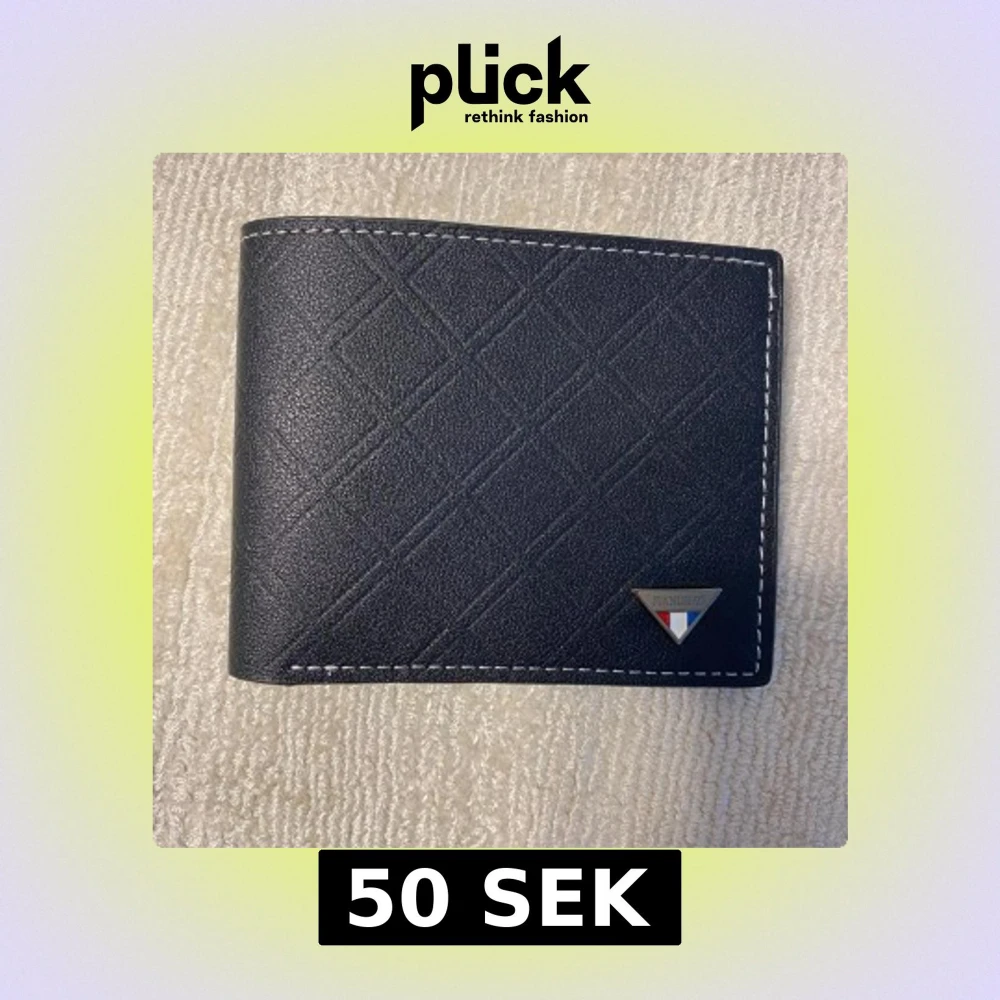 Snygg svart plånbok i skinn med diskret rutmönster och vit söm runt kanterna. Plånboken har flera kortfack och ett fönster för ID-kort. Metallogo på framsidan. Perfekt för att hålla ordning på kort och kontanter.