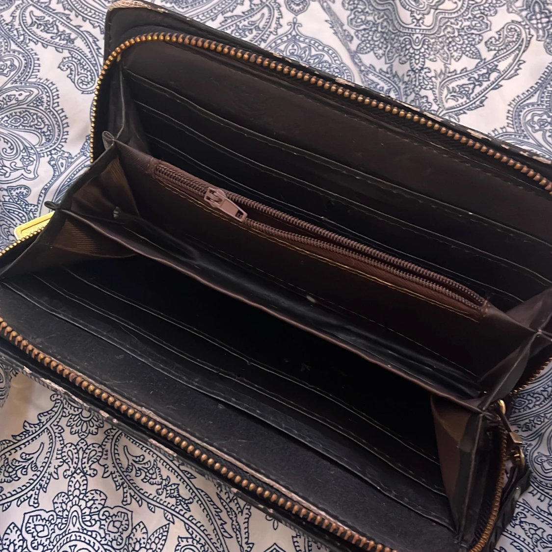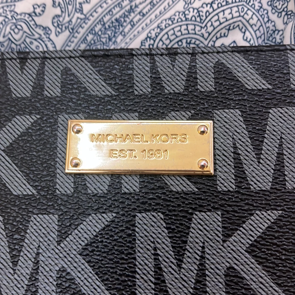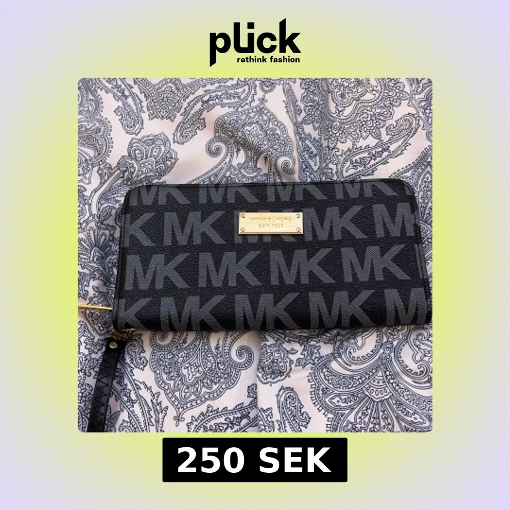 Snygg svart plånbok från Michael Kors med MK-logga och guldfärgad metallplatta. Plånboken har flera fack och en dragkedja för säker förvaring. Perfekt för att hålla ordning på kort och kontanter.