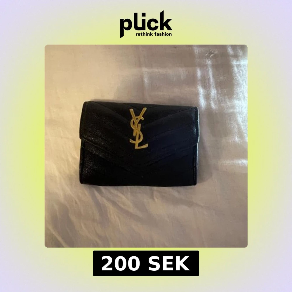 Säljer denna elegant svart plånbok från Saint Laurent i skinn med guldiga detaljer.❤️ Den har en stilren design med det ikoniska YSL-emblemet på framsidan och en praktisk knappstängning. Denna är ej äkta den ät fejk❤️