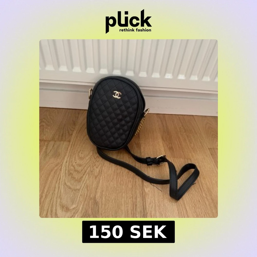 Säljer en svart quiltad axelväska med guldfärgade detaljer och klassisk logga framtill. Väskan har justerbar axelrem och elegant oval form. Perfekt för att bära det viktigaste med stil.