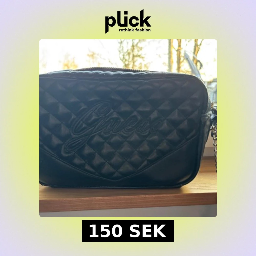 Säljer en svart quiltad axelväska från Guess med kedjerem och broderad logga på framsidan. Väskan har ett ljust innerfoder med mönster och flera fack för enkel organisering. Perfekt för att bära dina viktigaste saker.