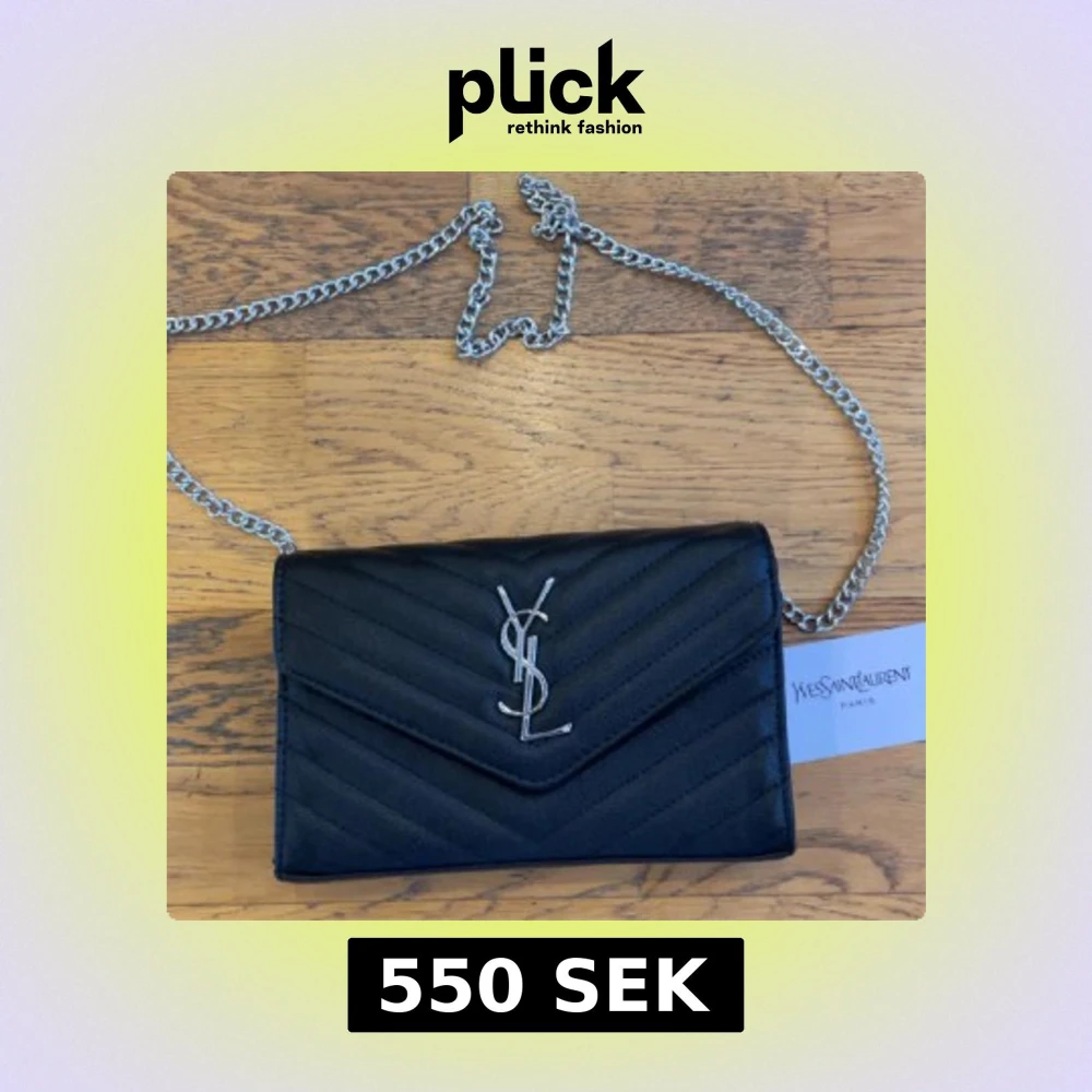 Snygg svart axelväska från YSL med silverfärgad kedja och ikonisk logga framtill. Väskan är quiltad i ett chevronmönster och har ett praktiskt fack med dragkedja inuti. Perfekt storlek för det viktigaste och ger en lyxig vibe till din outfit.