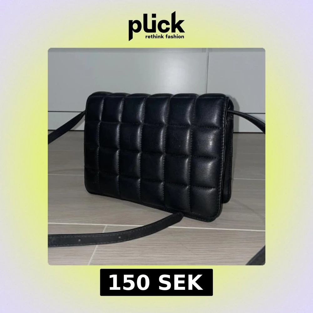 Säljer en svart axelväska med lång, justerbar rem. Bandet går att ta av och fungerar att bära väskan utan