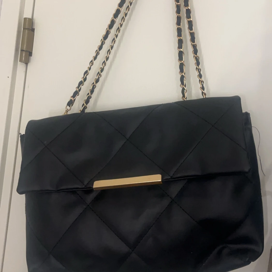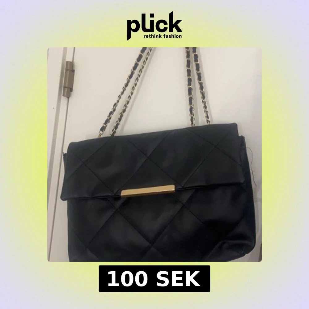Snygg svart axelväska med quiltat mönster och eleganta kedjedetaljer på axelremmen. Väskan har en stilren design med en guldfärgad detalj på framsidan. Perfekt för att ge en touch av lyx till din outfit.
