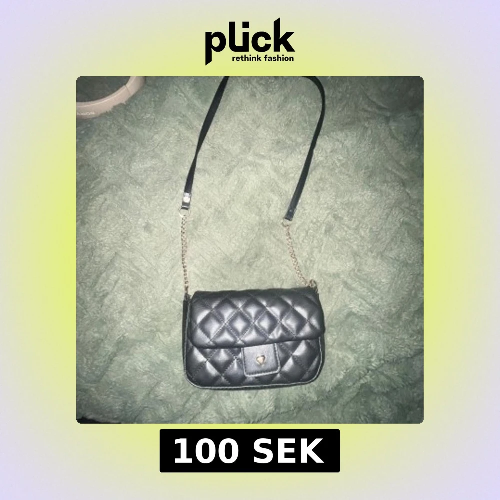 Snygg svart quiltad axelväska med kedjedetaljer och en liten hjärt knapp på framsidan. Perfekt för att bära dina nödvändigheter med stil. Väskan ett huvudfack med gott om plats.