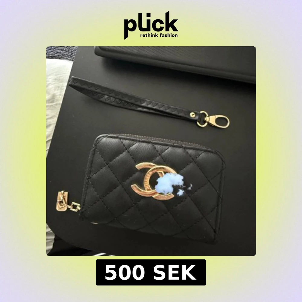 Snygg svart plånbok med klassiskt quiltat mönster och guldfärgad logga framtill. Plånboken har dragkedja och avtagbar handledsrem i skinn med guldfärgade detaljer. Perfekt för kort och kontanter.