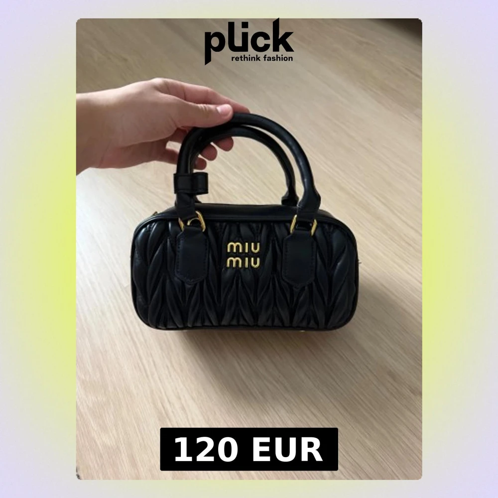 Snygg svart handväska från Miu Miu med quiltad design och guldfärgade detaljer. Väskan är tillverkad i skinn och har två handtag samt en dragkedja med Miu Miu-logga. Perfekt storlek för det viktigaste och riktigt lyxig vibe.