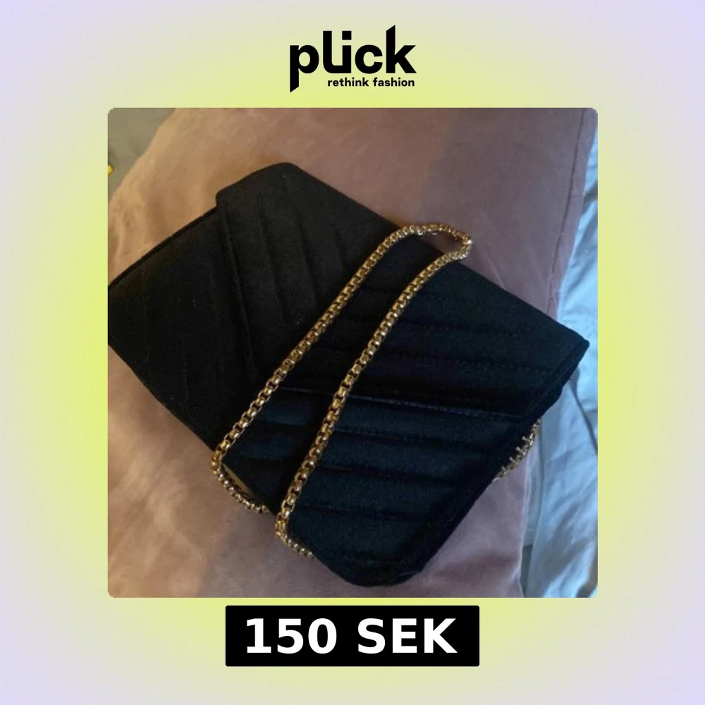 Snygg svart quiltad kuvertväska med elegant guldkedja. Perfekt för att ge en touch av glamour till din outfit. Väskan har en stilren design och är lätt att bära med sig.