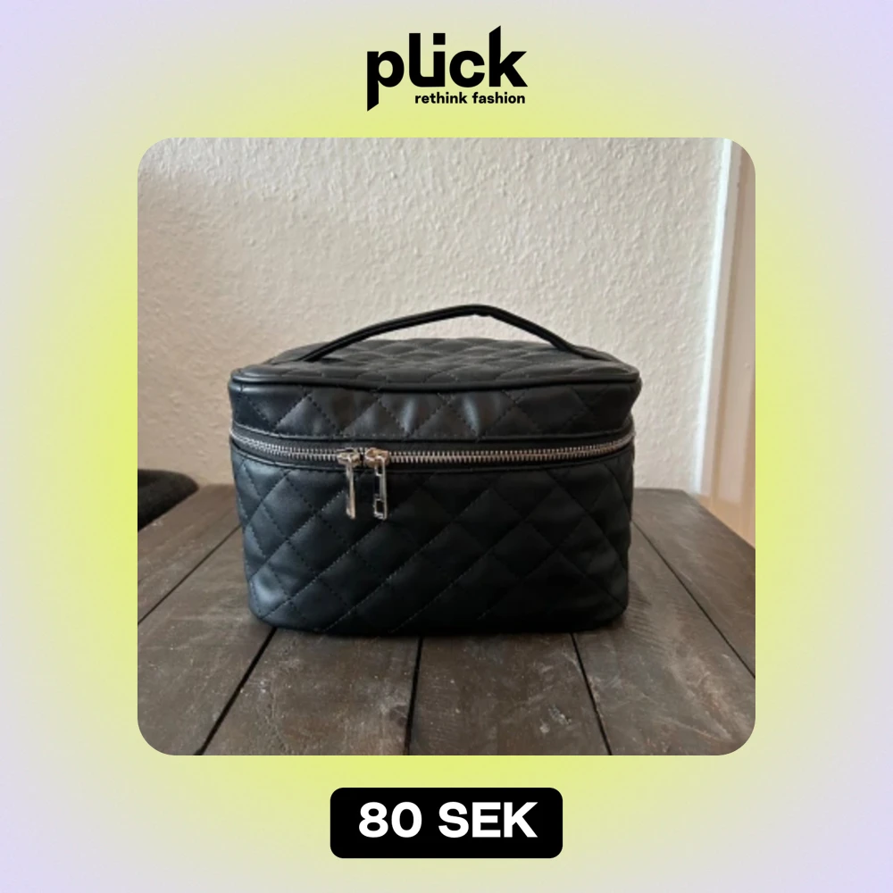 Säljer en snygg och praktisk svart quiltad necessär. Den har en dragkedja som går runt hela väskan och ett handtag upptill för enkel transport. Perfekt för att organisera dina toalettartiklar eller smink när du är på resande fot!