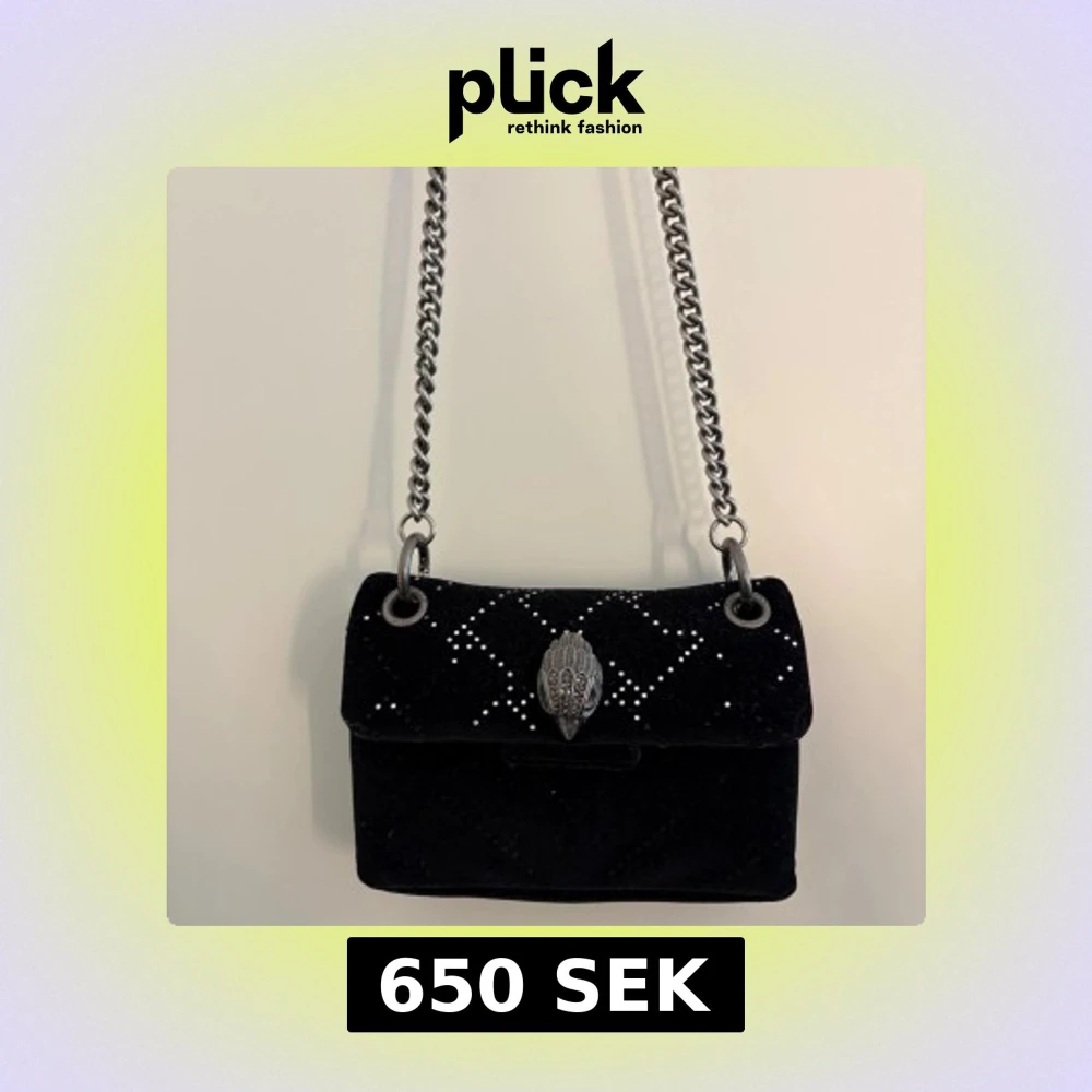 Snygg svart axelväska i sammet från Kurt Geiger med silverfärgad kedjerem och coolt fågelspänne framtill. Väskan har små silvriga nitar i rutmönster och en metallbricka med logga på baksidan. Perfekt storlek för det viktigaste.