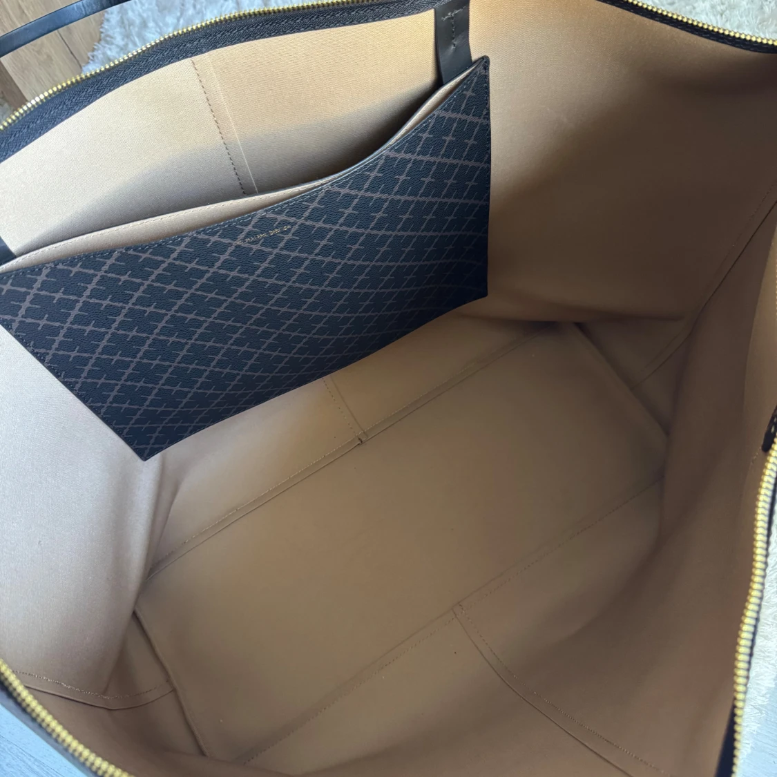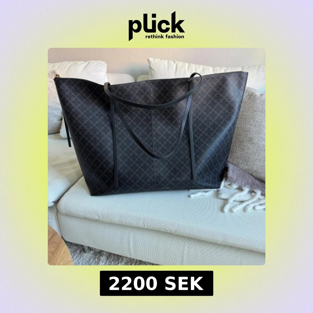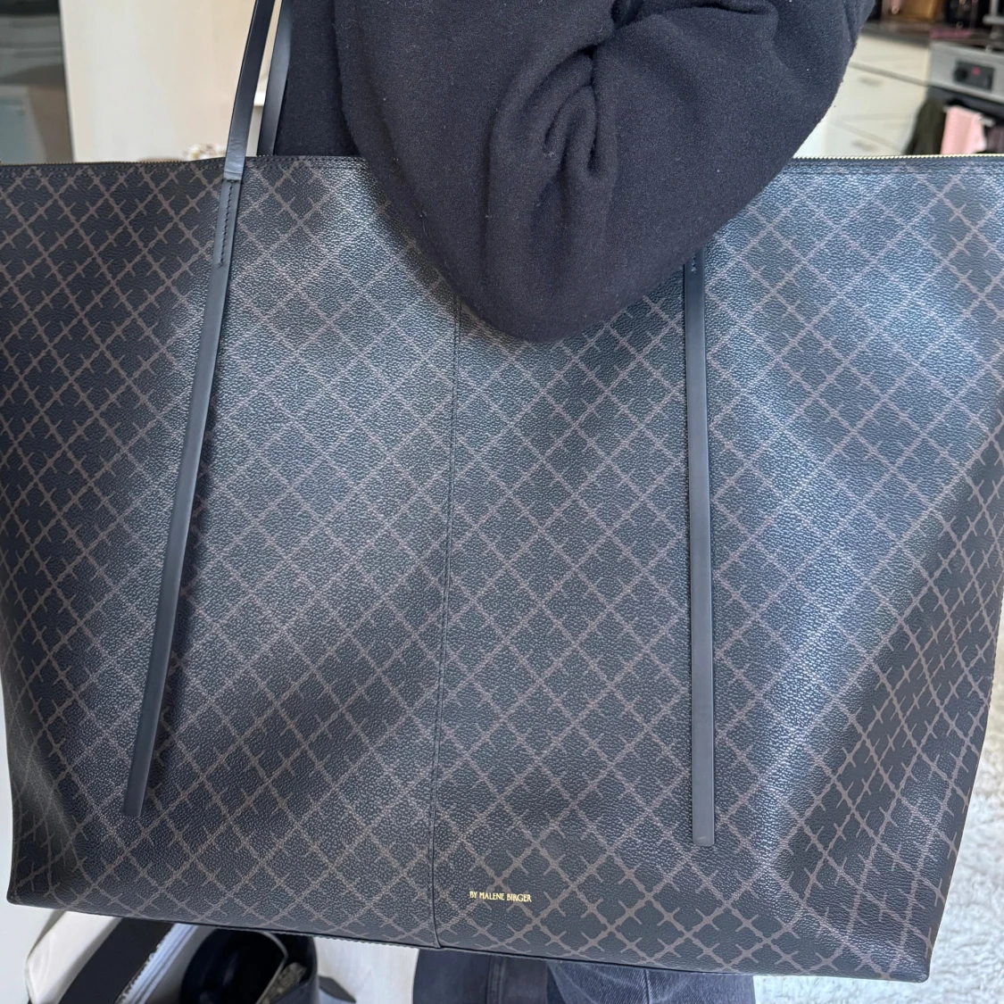 Stor och rymlig shoppingväska från By Malene Birger i svart med diskret rutigt mönster. Väskan har långa svarta axelband, guldfärgad dragkedja och en innerficka. Tillverkad i slitstarkt syntetmaterial och levereras med dustbag. Pris går att diskutera