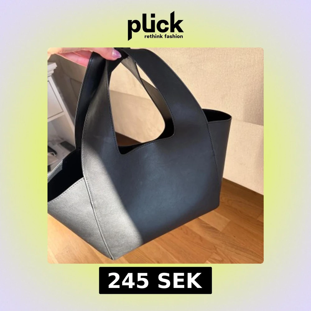 Stilren svart shoppingväska med minimalistisk design och breda handtag. Väskan är rymlig och har en modern, kantig form som passar perfekt för att bära allt du behöver. Tillverkad i slätt skinn för en clean och tidlös look.