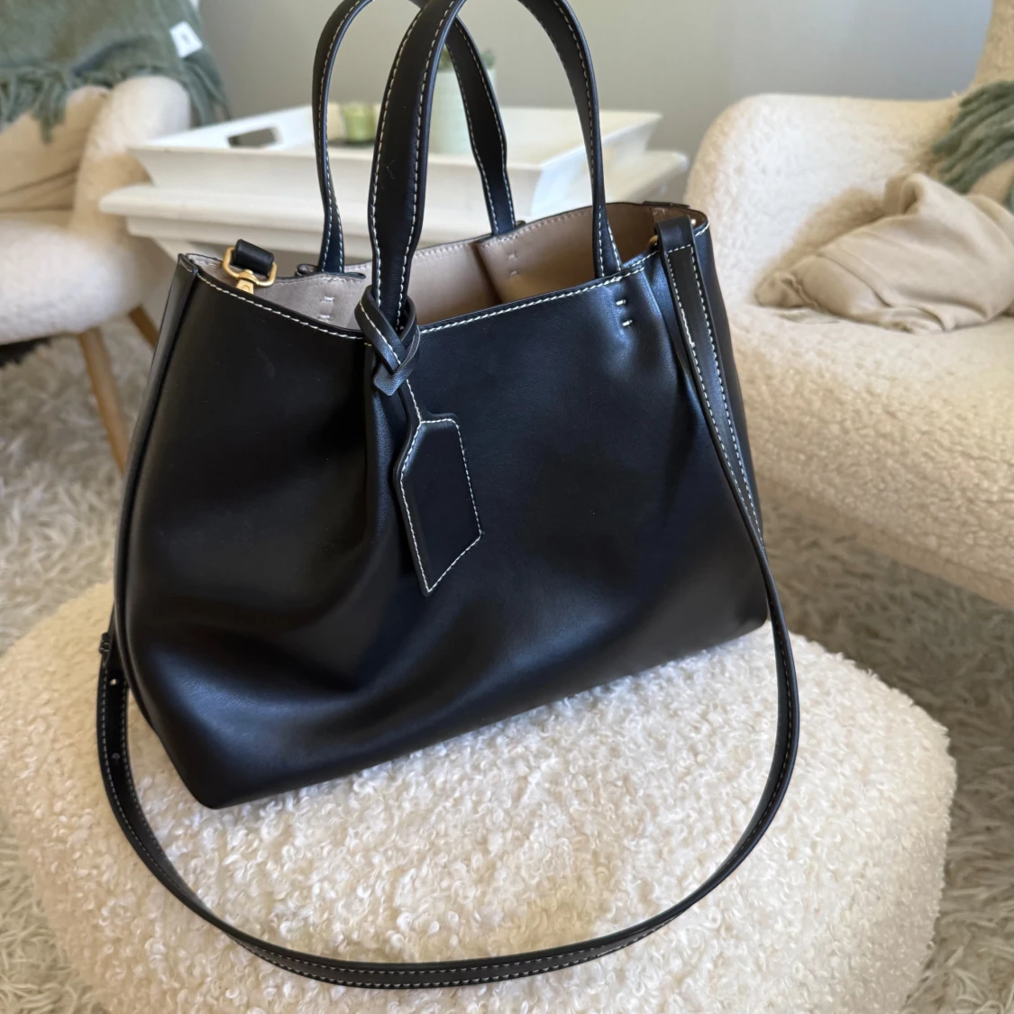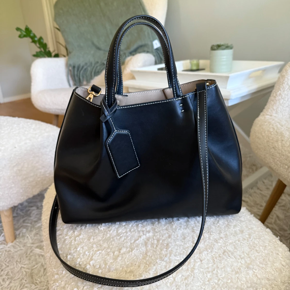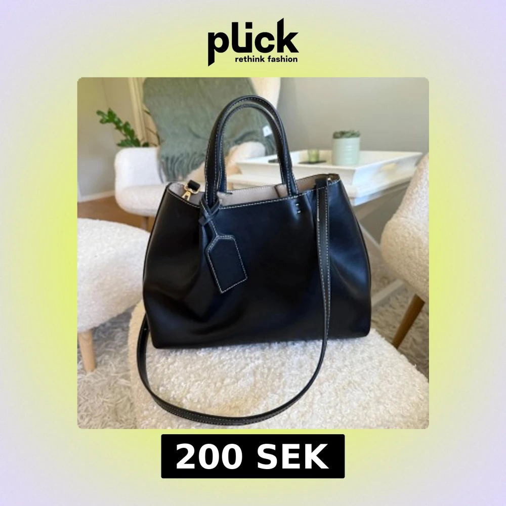 Stilren svart handväska i skinn med både handtag och justerbar axelrem. Väskans extra innehåll går att ta bort, även ”snöret” om man vill!☺️Köpt i Spanien men minns ej affär! Inte använd