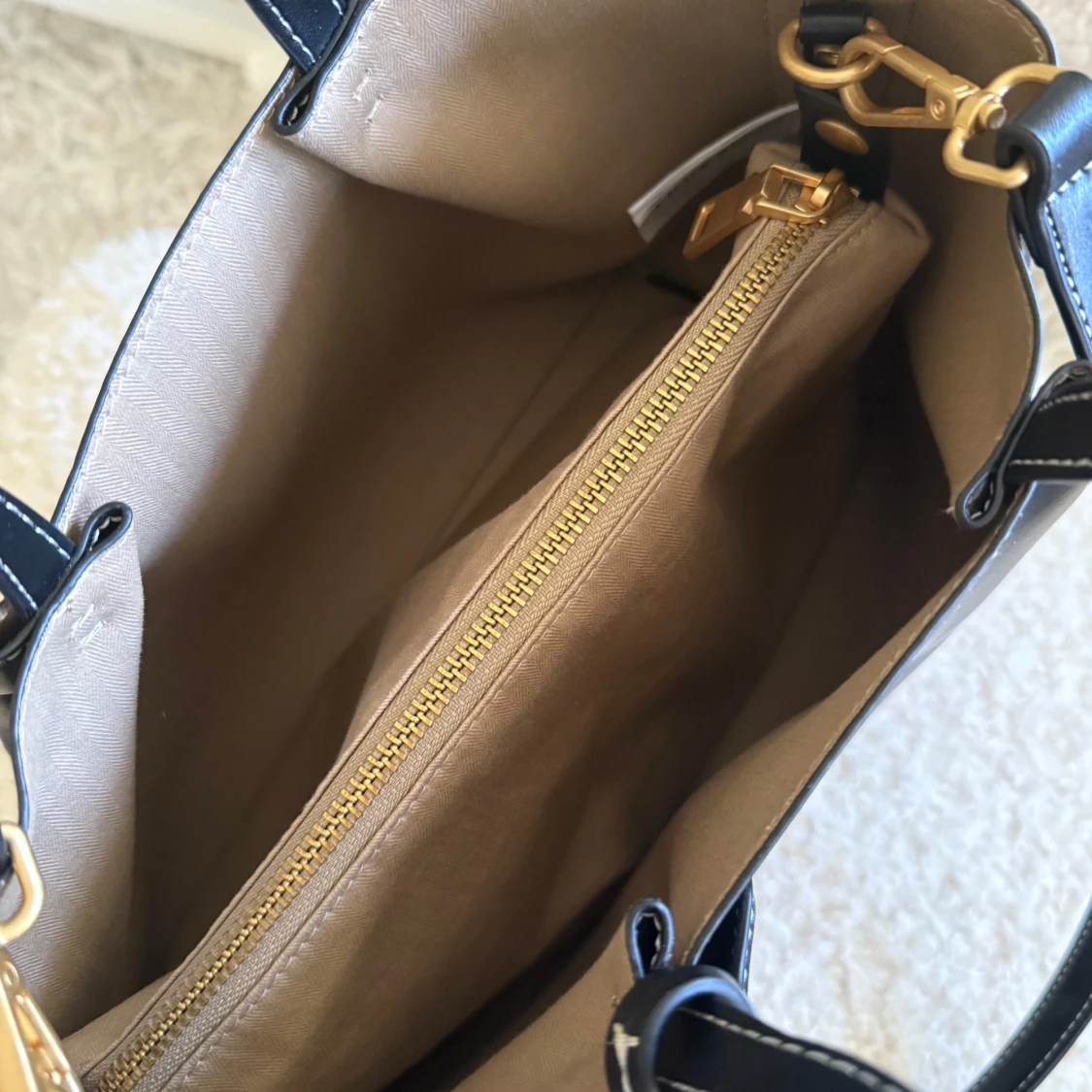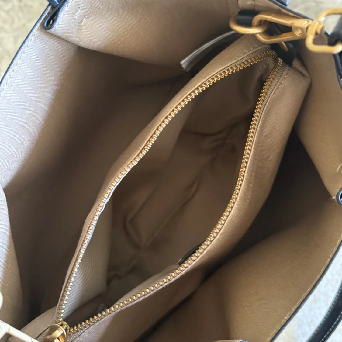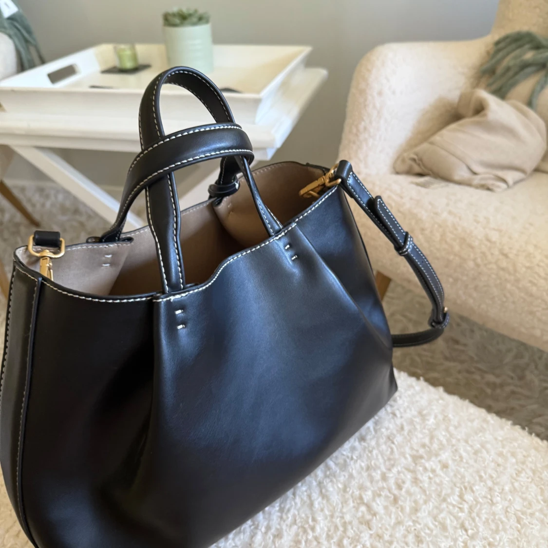 Stilren svart handväska i skinn med både handtag och justerbar axelrem. Väskans extra innehåll går att ta bort, även ”snöret” om man vill!☺️Köpt i Spanien men minns ej affär! Inte använd