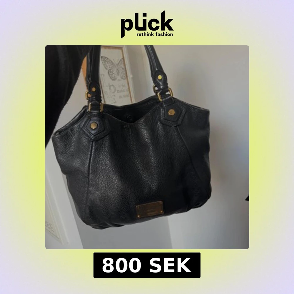 Snygg svart skinnväska från Marc by Marc Jacobs med gulddetaljer och ett stilrent mönstrat foder. Väskan har två rejäla handtag och en praktisk storlek för vardagsbruk. Perfekt för att bära med sig alla nödvändigheter med stil.