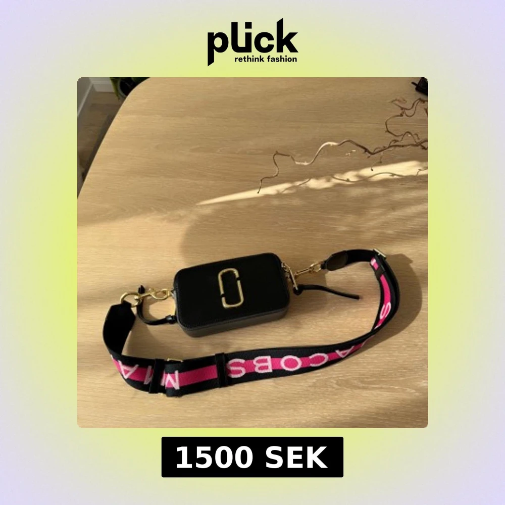 Säljer en svart axelväska från Marc Jacobs med bred axelrem i svart, rosa och vitt med logga. Väskan har guldfärgade detaljer och dubbla dragkedjor upptill samt en vit panel på ovansidan. Perfekt storlek för det viktigaste.