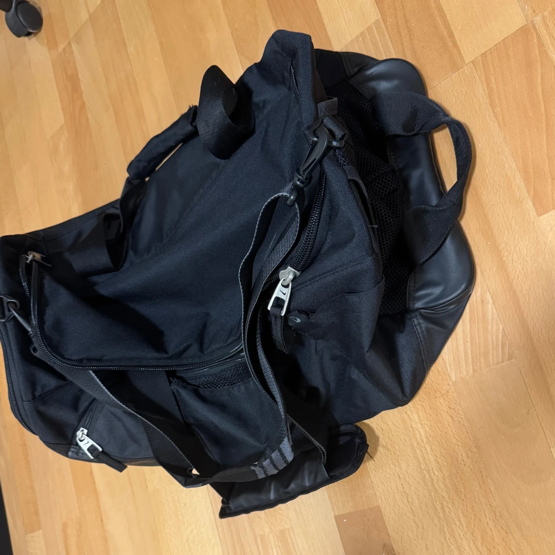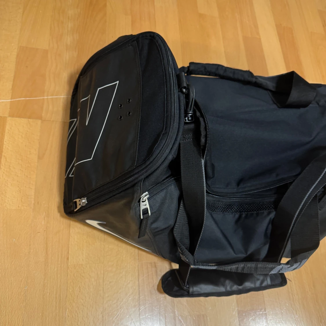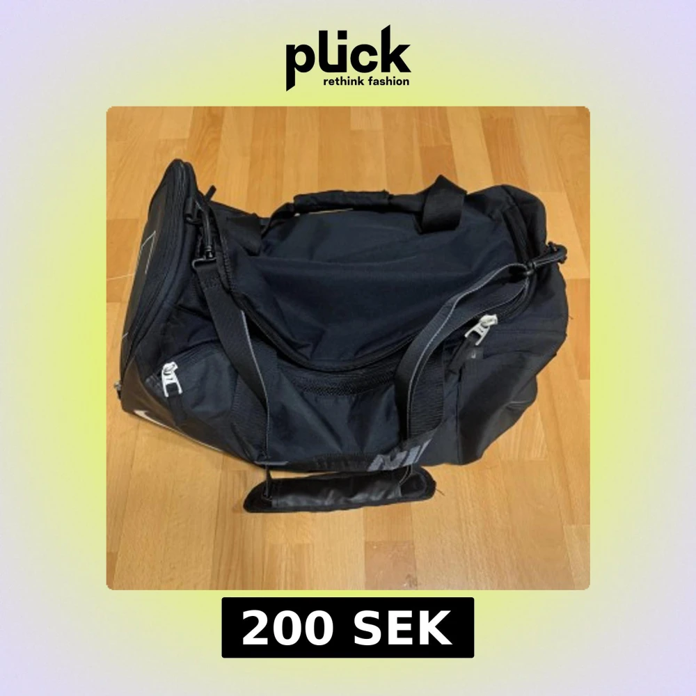 Stor svart sportbag från Nike med flera fack och dragkedjor. Väskan har rejäla handtag med vaddering och en justerbar axelrem. Snyggt Nike-tryck på sidan och detaljer i silver. Perfekt för gymmet eller träningen.