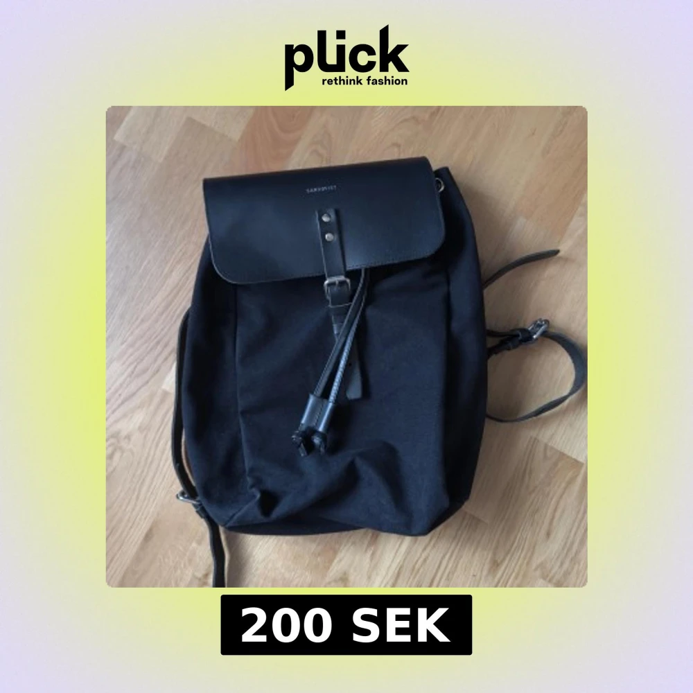 Snygg svart ryggsäck med minimalistisk design och lock i skinn. Väskan har ett klassiskt spänne framtill och praktiskt handtag upptill. Perfekt för dig som gillar enkel och stilren look.