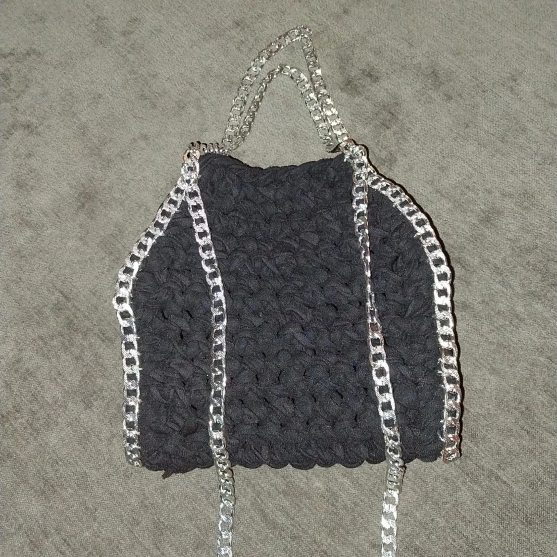 Snygg svart virkad väska med silverfärgade kedjedetaljer. Perfekt för att ge din outfit en unik touch. Väskan har en enkel design med två kedjehandtag som ger en cool kontrast till det mjuka materialet.