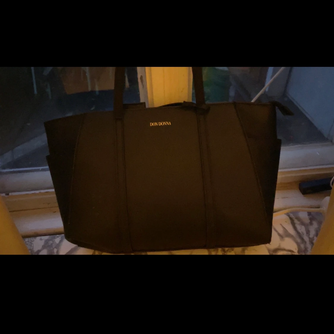 Stilren svart väska med gulddetaljer från Don Donna med två rejäla handtag och diskret logga i guld framtill. Väskan har en rymlig design och är perfekt för dig som vill ha plats med allt du behöver. Tillverkad i ett tåligt syntetmaterial.