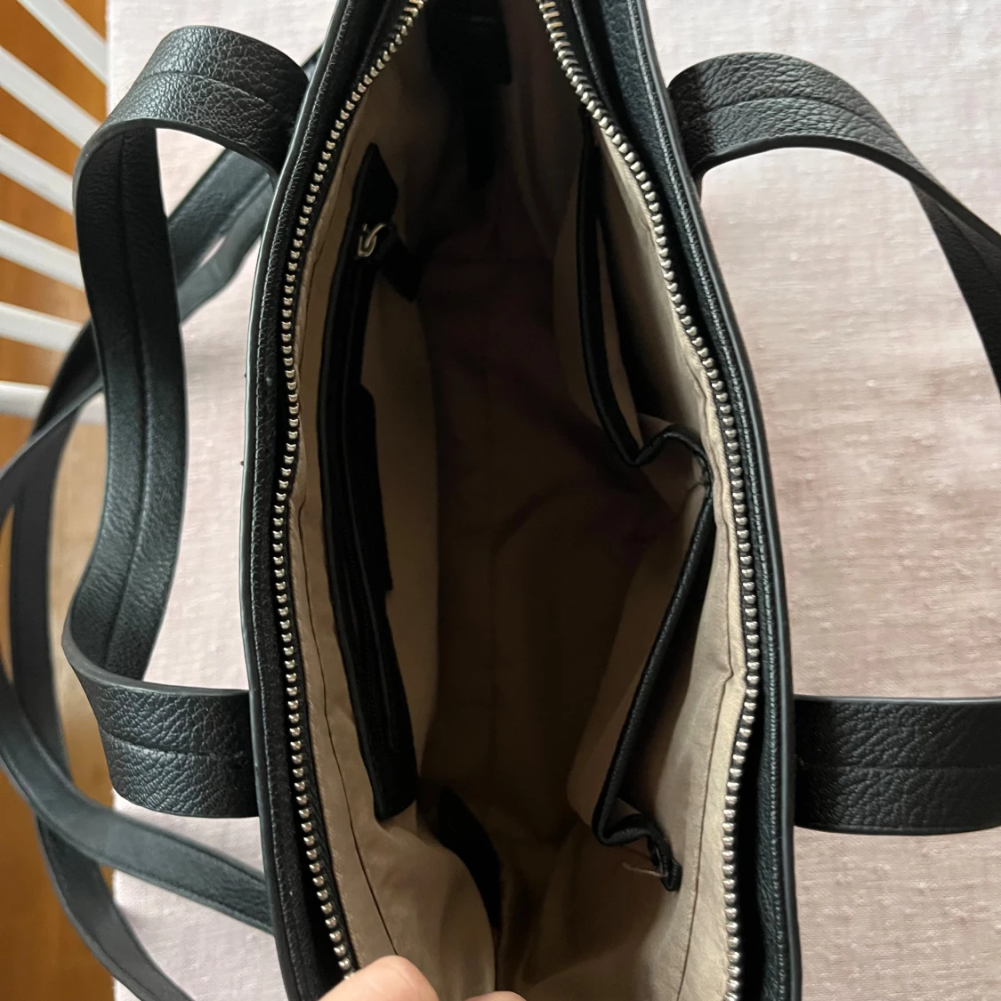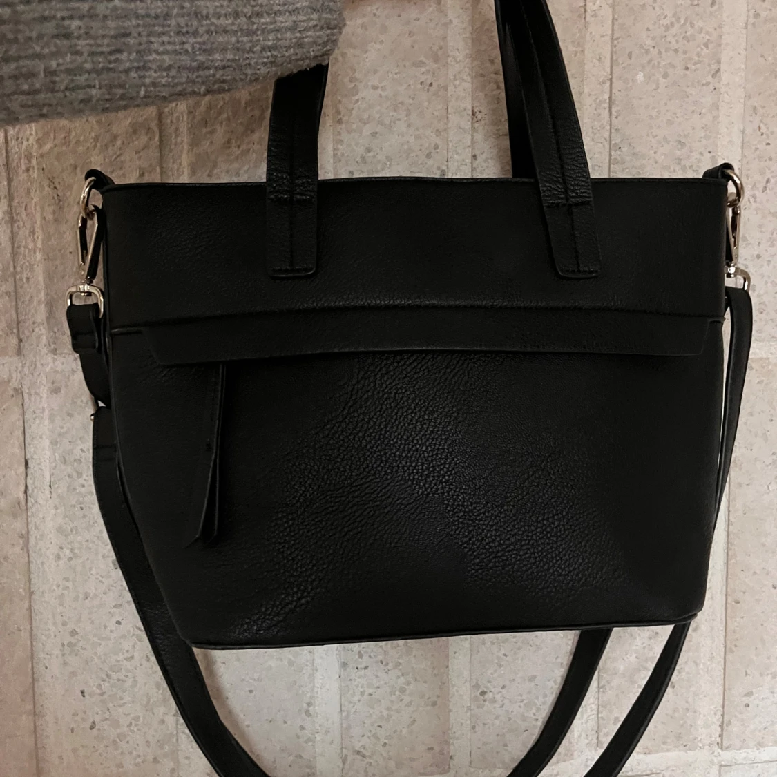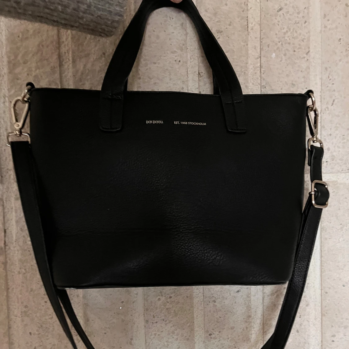 Snygg svart axelväska från Don Donna. Väskan har justerbar axelrem, dragkedja upptill och flera innerfack.