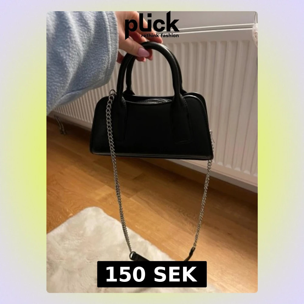 Snygg svart handväska i skinnimitation med stilren form och silverfärgad kedja som axelrem. Väskan har två handtag och dragkedja upptill. Väldigt rymlig och enkel att bära med sig. Har använt den typ 3 gånger så den är i nyskick!🤩💕 Pris går att diskutera☺️