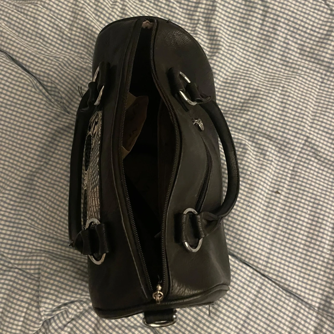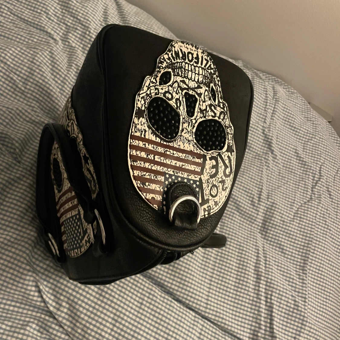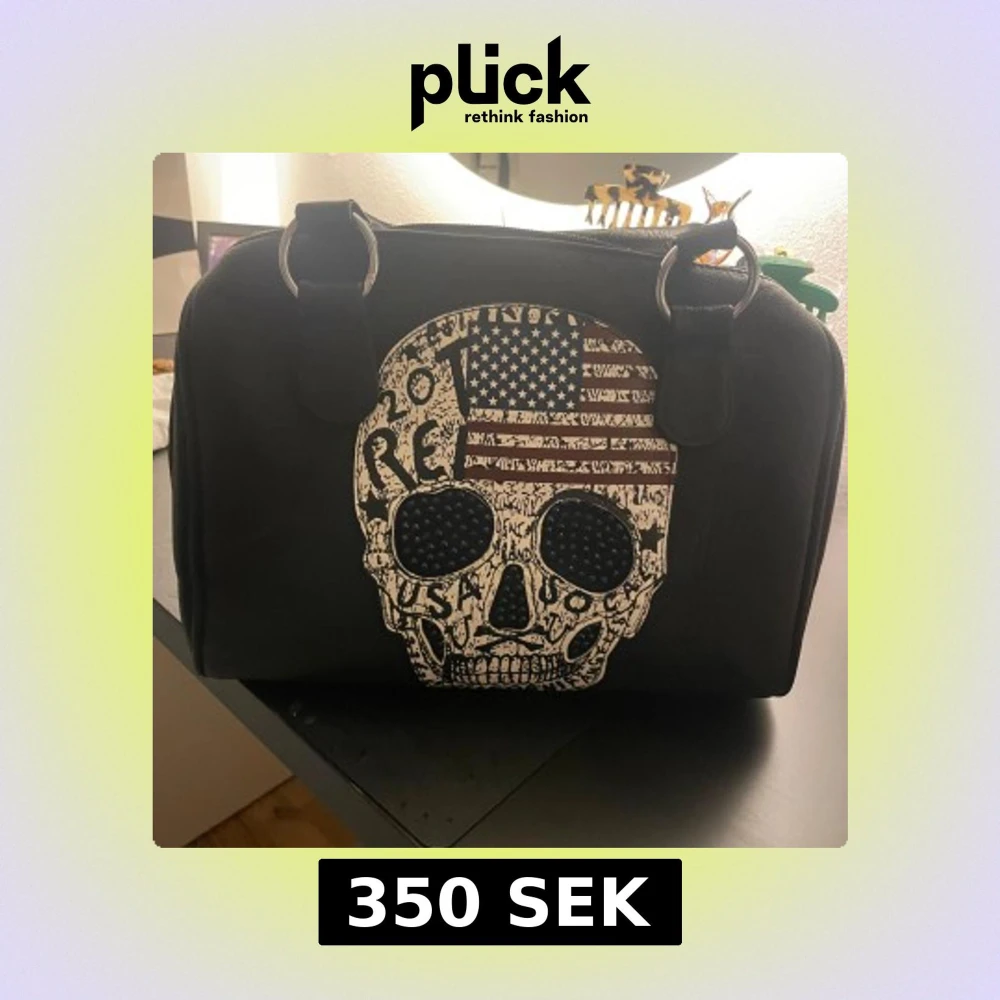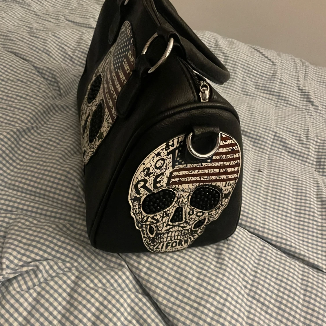 Unik svart väska med dödskalle motiv och lite svarta nitar. Finns ett längre band till väskan. Köpt i USA och nästan oanvänd