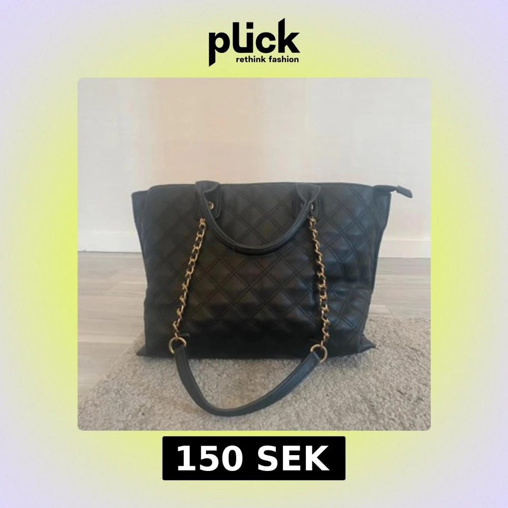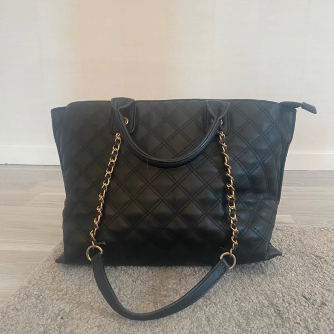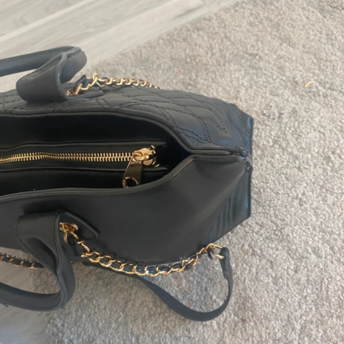 Stilren svart väska med snygga guldfärgade kedjedetaljer på axelremmen. Väskan har dragkedja upptill och gott om plats för allt du behöver.