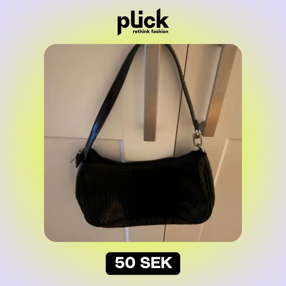 svart handväska med en glansig yta och krokodilmönster. Väskan har en dragkedja upptill och en axelrem för enkel bärning. Mycket rymlig💕