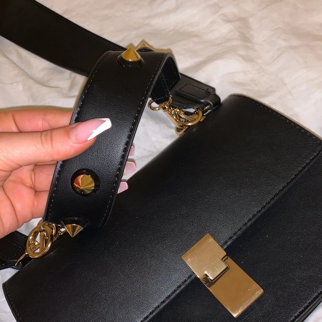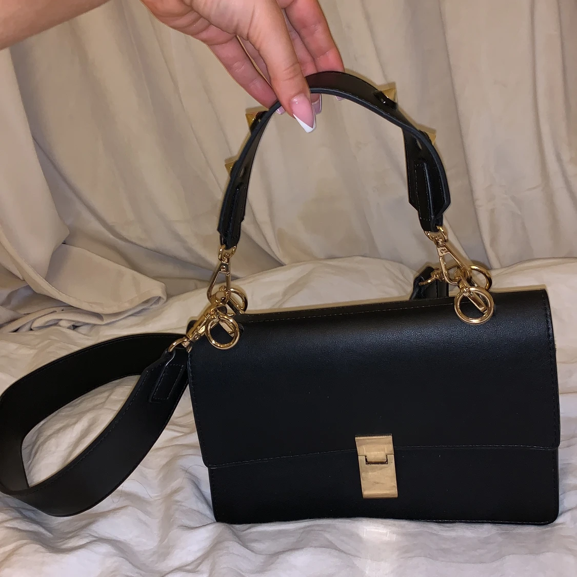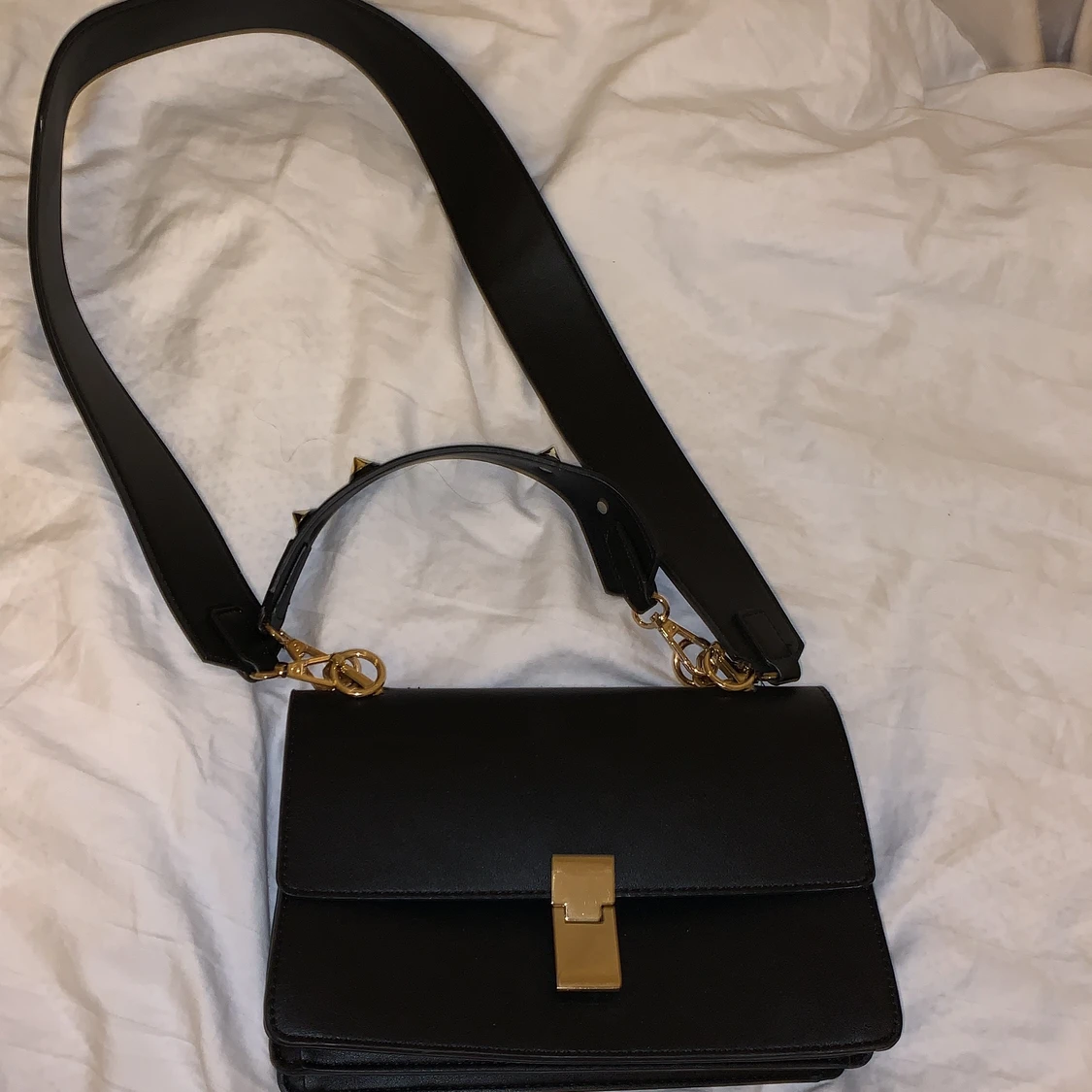 Svart rymplig väska med tjockt band (långt) samt kortare band med nitar. Väldigt bra skick, inga skador. Pris kan diskuteras vid snabb affär:)