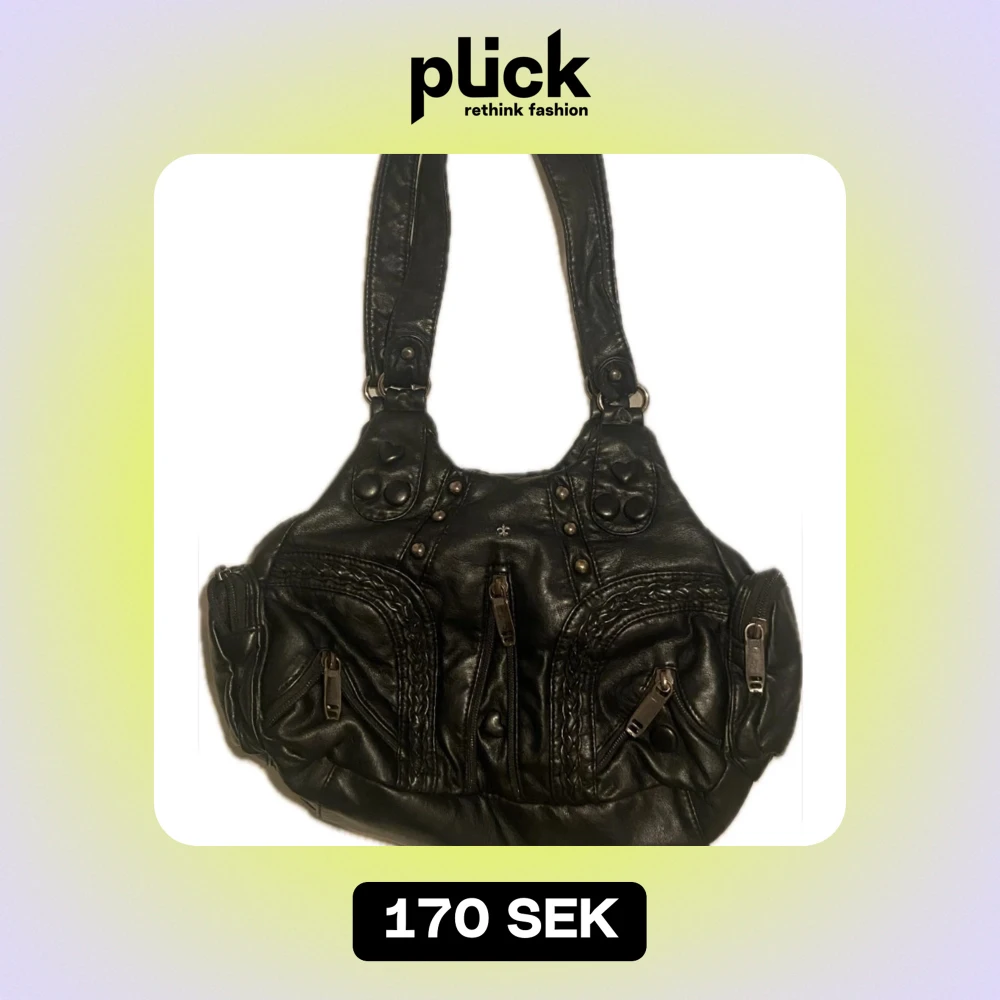 Snygg svart axelväska i skinn med flera dragkedjor och nitar som detaljer! jätte bra skick och inga defekter 💕💕 skriv vid frågor! 24x33 cm