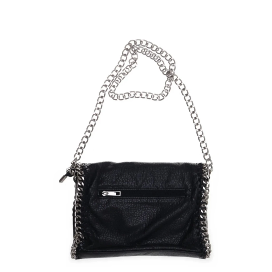 Cool svart axelväska från Tiamo i skinnimitation med grov silverfärgad kedja som axelrem och runt kanterna. Väskan har dragkedja baktill och en stilren, lite edgy look som passar perfekt till din outfit.