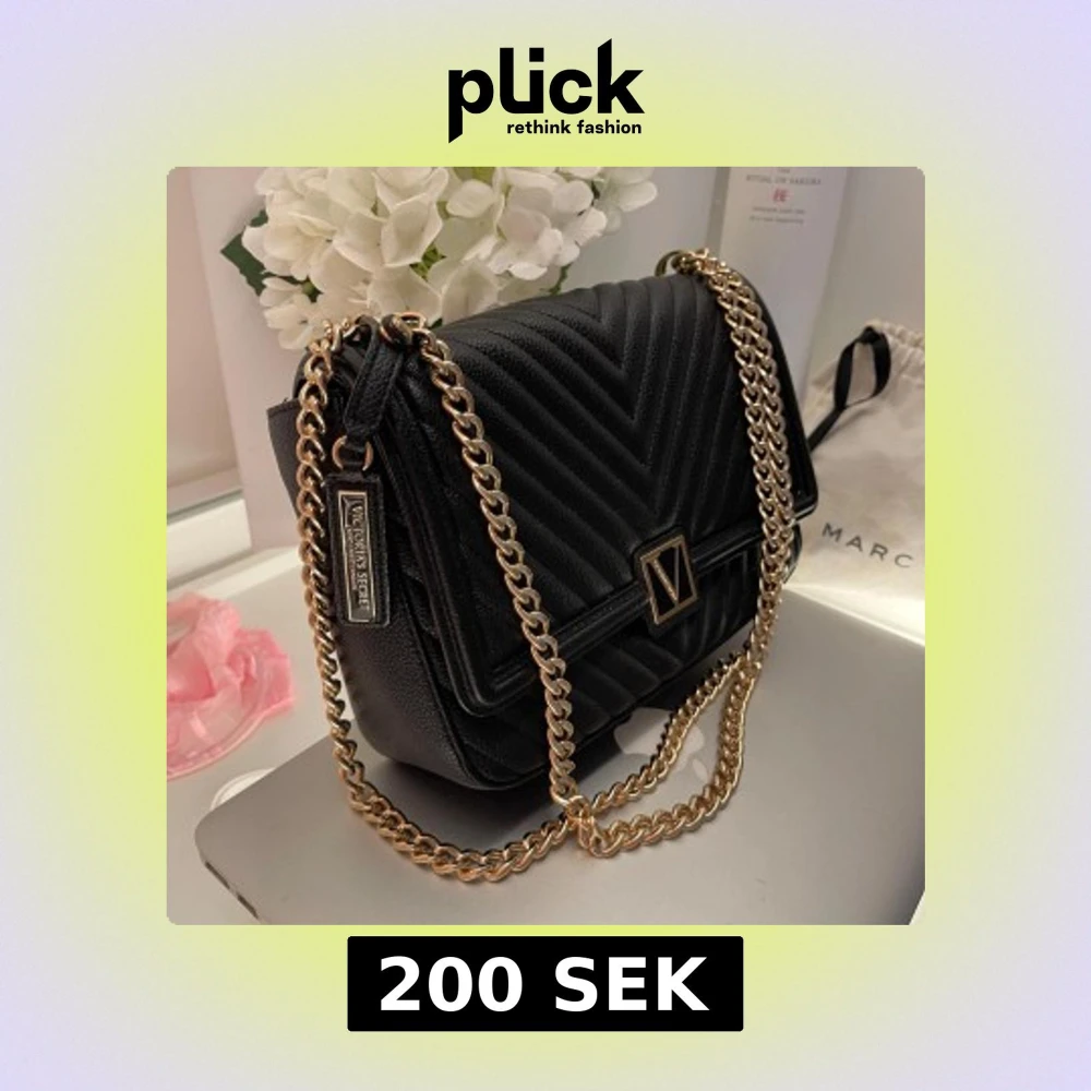 Snygg svart axelväska från Victoria's Secret med quiltad design och guldfärgad kedja. Väskan har ett V-spänne framtill och är tillverkad i skinnimitation. Perfekt storlek för det viktigaste och ger en lyxig känsla till din outfit.
